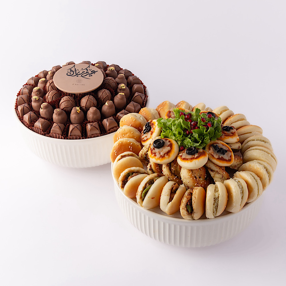 صينية أنيقة تضم تشكيلة فاخرة من الشوكولاتة المميزة والفطاير، محضرة خصيصا لمناسبات العيد ومثالية للضيافة والهدية.