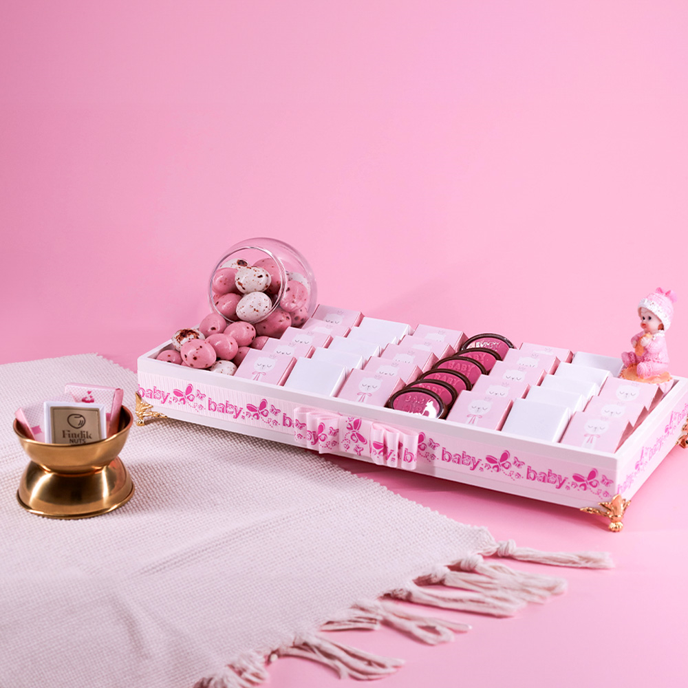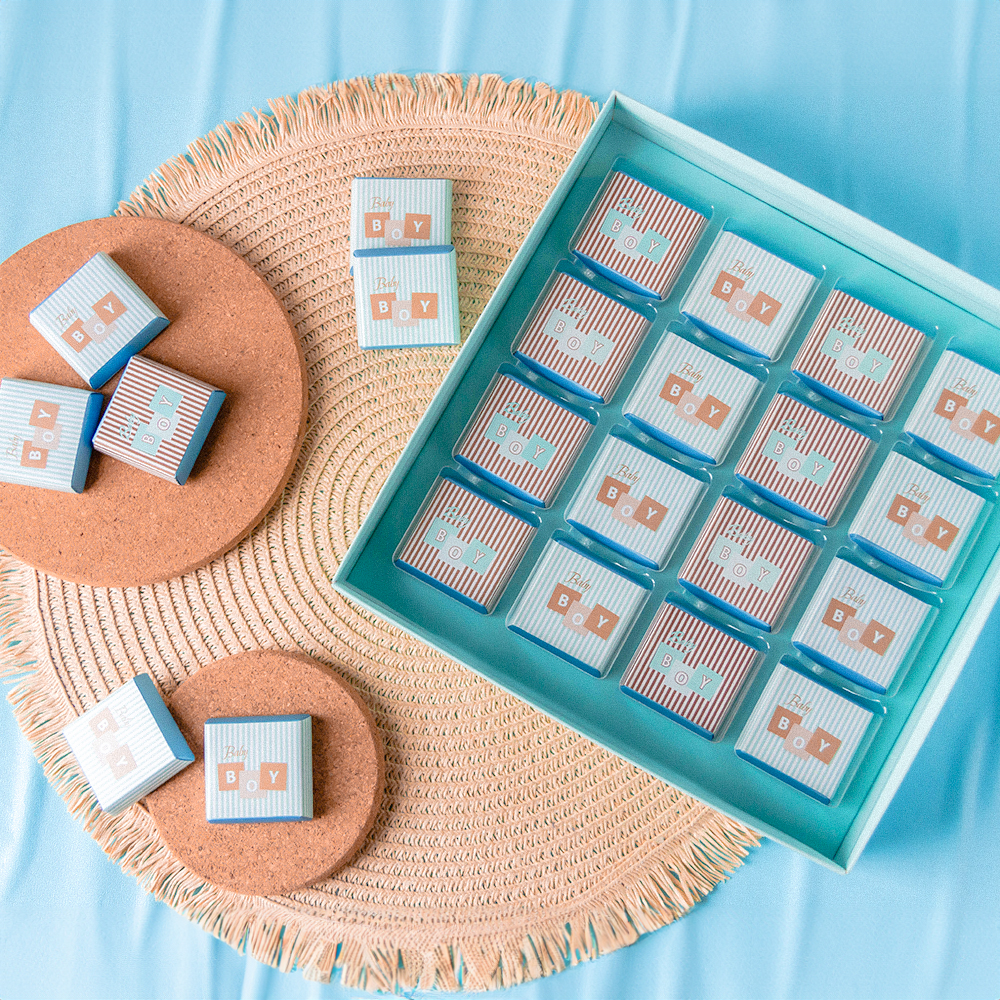 صينية الشوكولاته تحتوي على شوكولاتة مربعة بسكويت صبي 220 جرام شوكولاتة مربعة بسكويت ويفر ابيض 280 جرام ملبس شوكولاتة بيض الطائر ازرق وابيض 480 جرام.