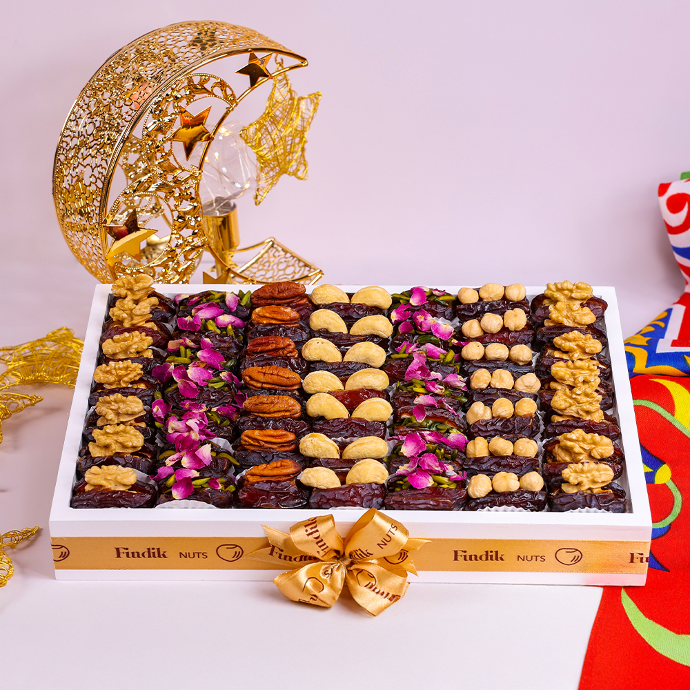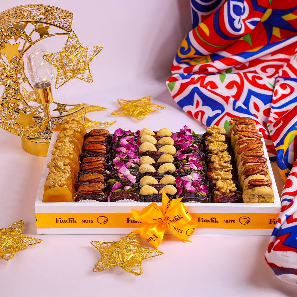 هذه الصينية تحتوي على: 210 جرام من المكسرات المشكلة الصحية. 120 جرام من الفواكه المجففة الخالية من السكر. 110 جرام من الخضروات المشكلة الصحية.