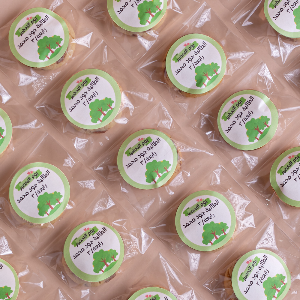 علبة تحتوي على 30 قطعة من كوكيز شوكولاتة الحليب مغلفة بشكل منفرد ويمكن تخصيصها بالاسم.