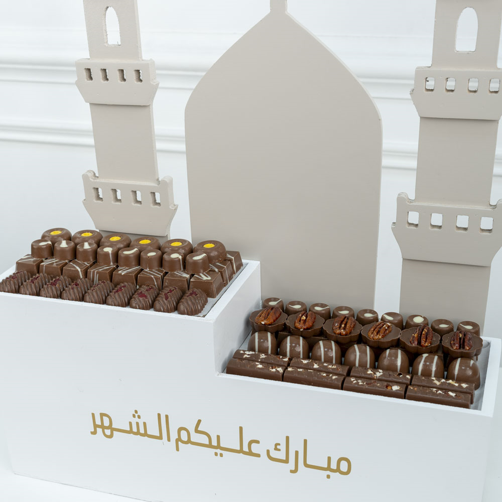 ستاند خشبي فخم يحتوي على الشوكولاتة البلجيكية متعددة الحشوات.