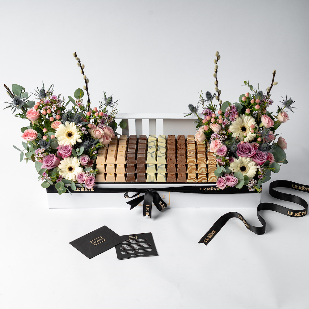 تنسيق صينية باللون الابيض مع مجموعه من بوكس الشوكولاتة والشموع والعطور مع تنسيق زهور باللون البنفسجي واللافندر.