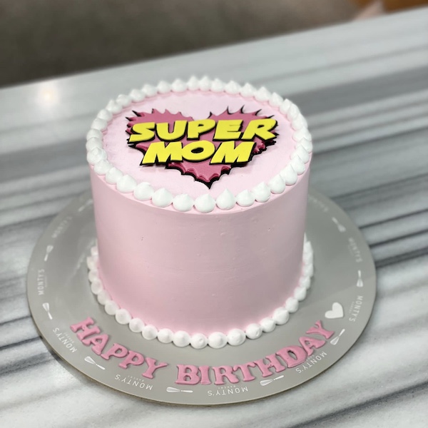 كيكة أمي الخاصة مزينة بالزهور والجربيرا الوردية.