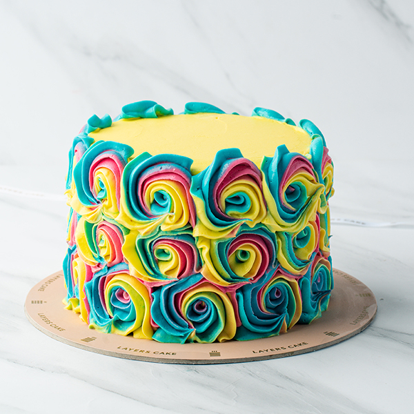 كيكة بحجم 6 إنش، مكونة من أربع طبقات بنكهة الشوكولاتة، الريد فلفيت، والفانيليا، مغطاة بالكريم تشيز فروستينج، تكفي من 6 إلى 8 أشخاص.