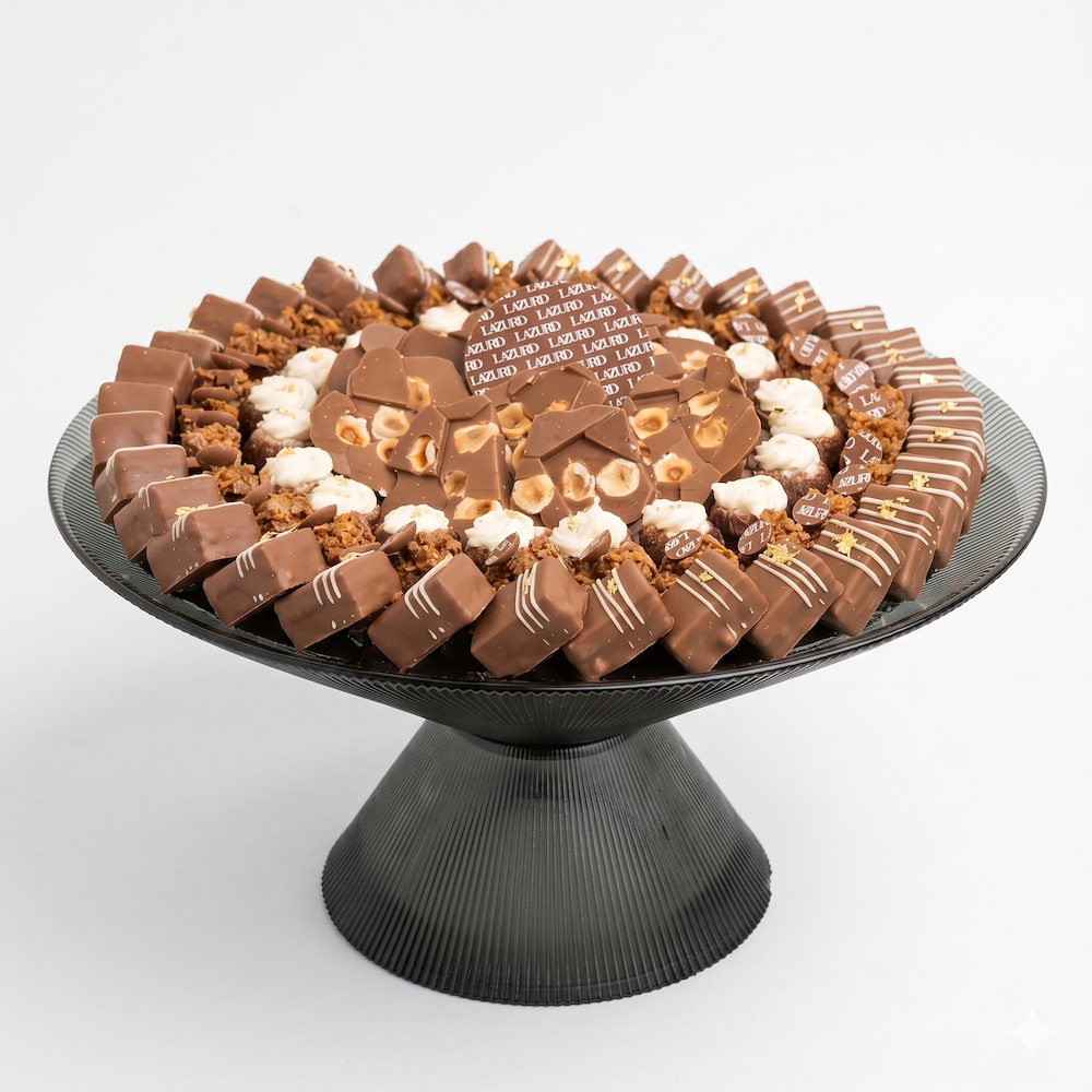 ستاند مخروطي أسود يحتوي على شوكولاتة بأنواع مختلفة: ويفرينا (ويفر)، كرانشي، هاواي (لوز ماسكاربوني، الكورن فلكس، وجوز الهند)، والبندق.