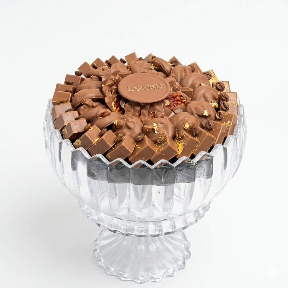 صينية كريستال تحتوي على الشوكولاتة بنكهات التيراميسو، التشوكو ال (كراميل مع بيكان) والبيكان.