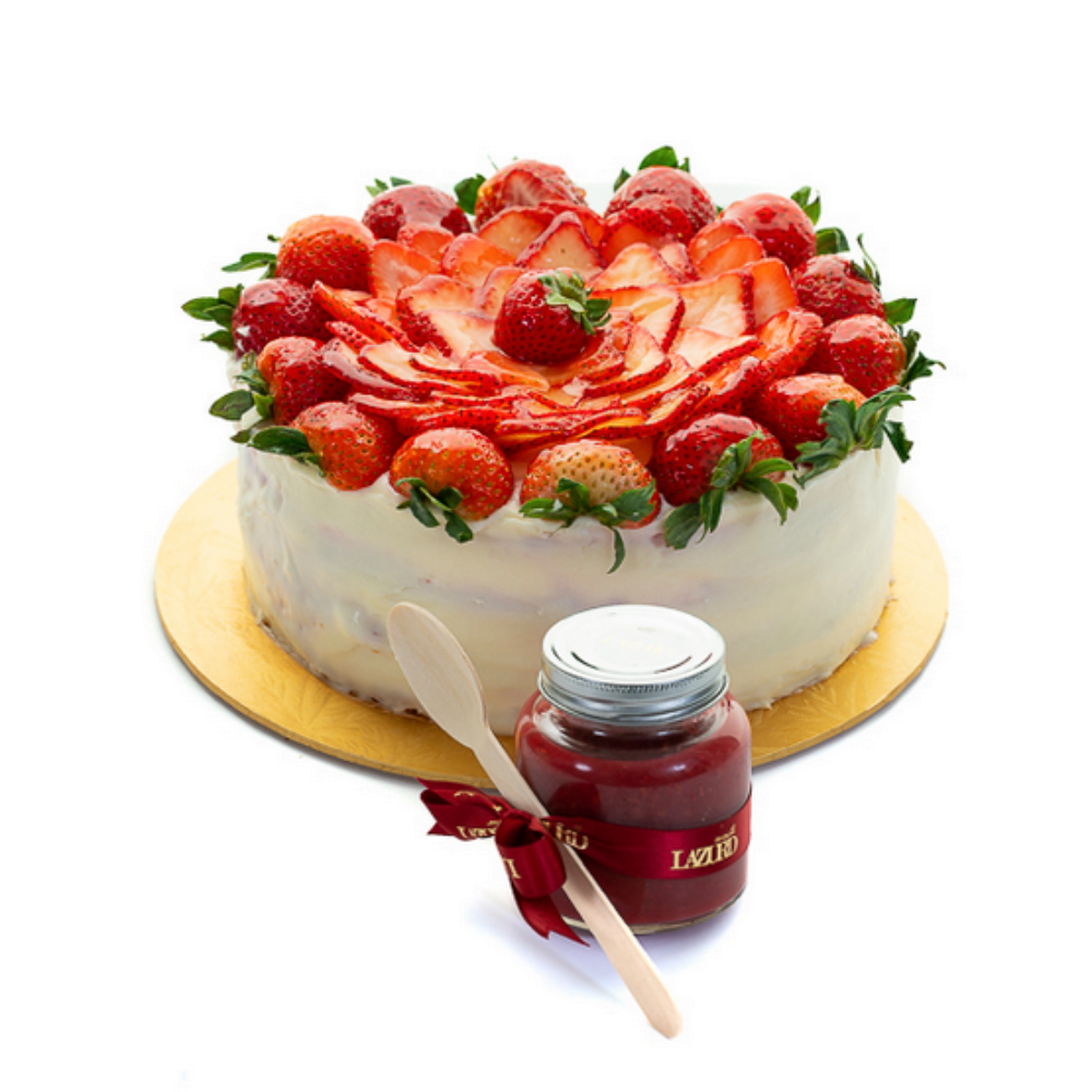 كيكة الفانيلا الإسفنجية مع كريمة الفروستينق ومربى التوت ومزينة بالفراولة الطازجة، تكفي من 6 الى 8 أشخاص.