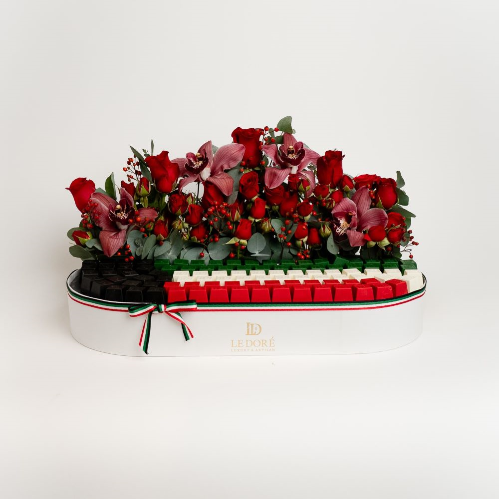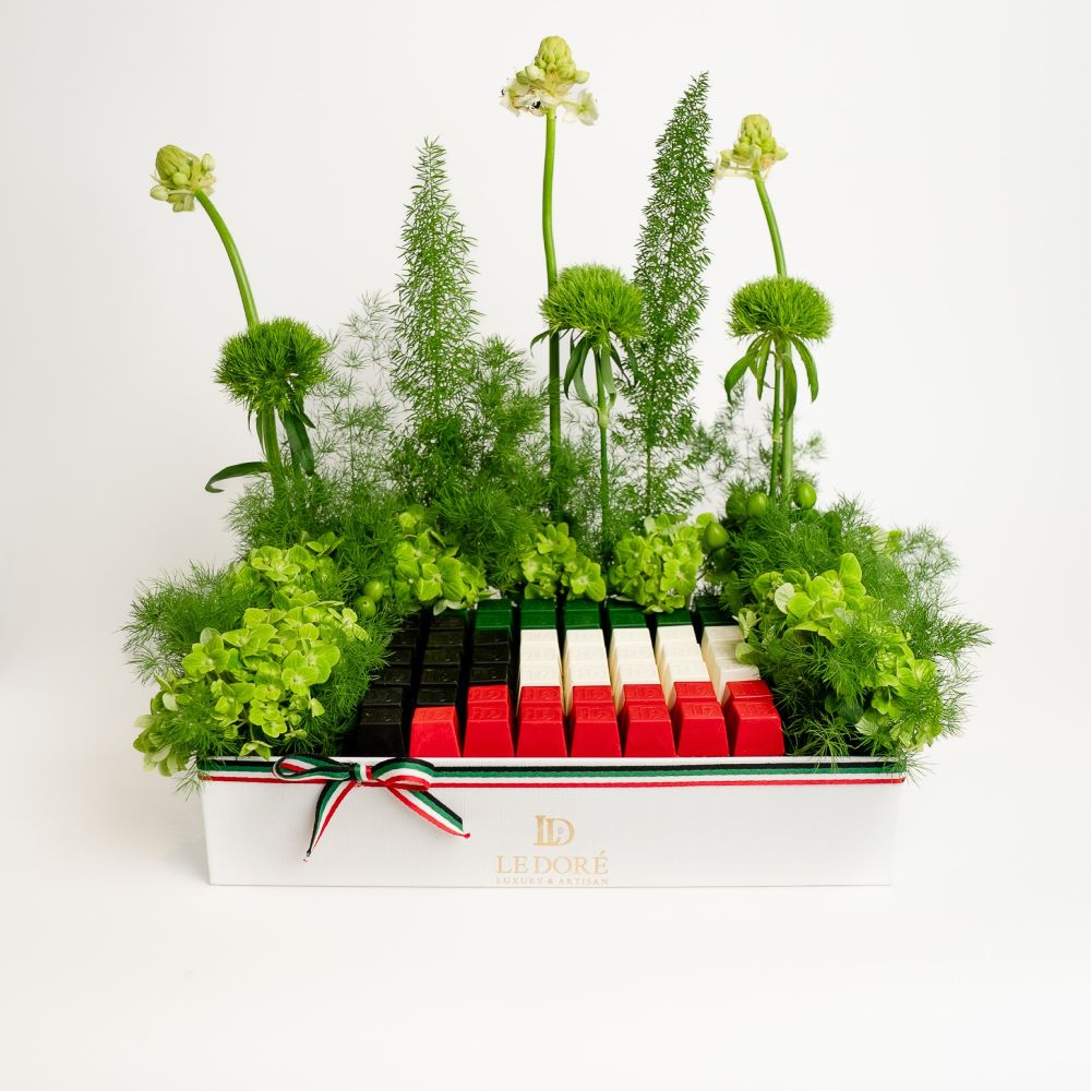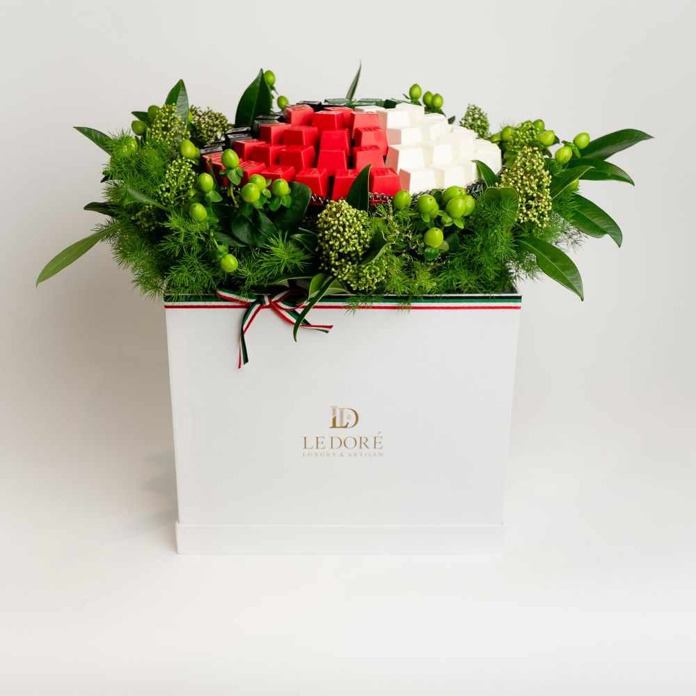 علبة تحتوي على 12 كيس صغير مع 3 قطع من الشوكولاتة الفاخرة في كل كيس، جرة من البيكان الكراميل، جرة من البندق المميز، علبتين تحتوي كل منهما على 4 قطع من الشوكولاتة وتنسيق زهور.