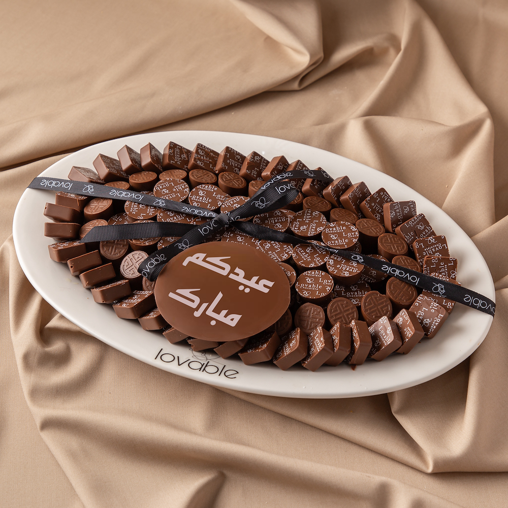 طبق أبيض بيضاوي يحتوي على 1 كيلو من الشوكولاتة السويسرية مع عبارة خاصة.
