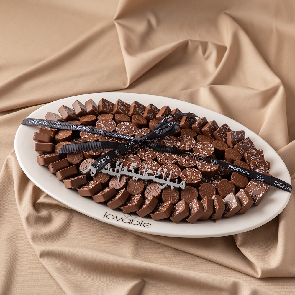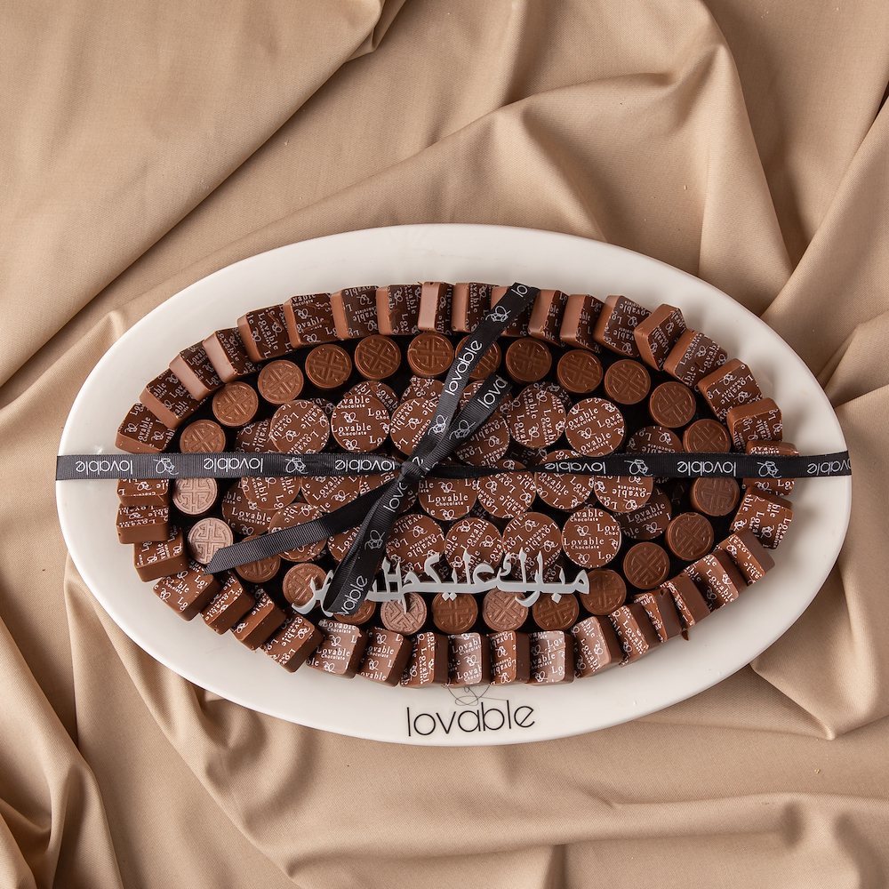 طبق أبيض بيضاوي يحتوي على 1 كيلو من الشوكولاتة السويسرية مع عبارة خاصة.