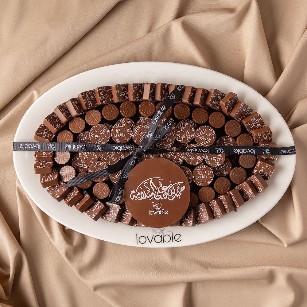 طبق أبيض بيضاوي يحتوي على 1 كيلو من الشوكولاتة السويسرية مع عبارة خاصة.