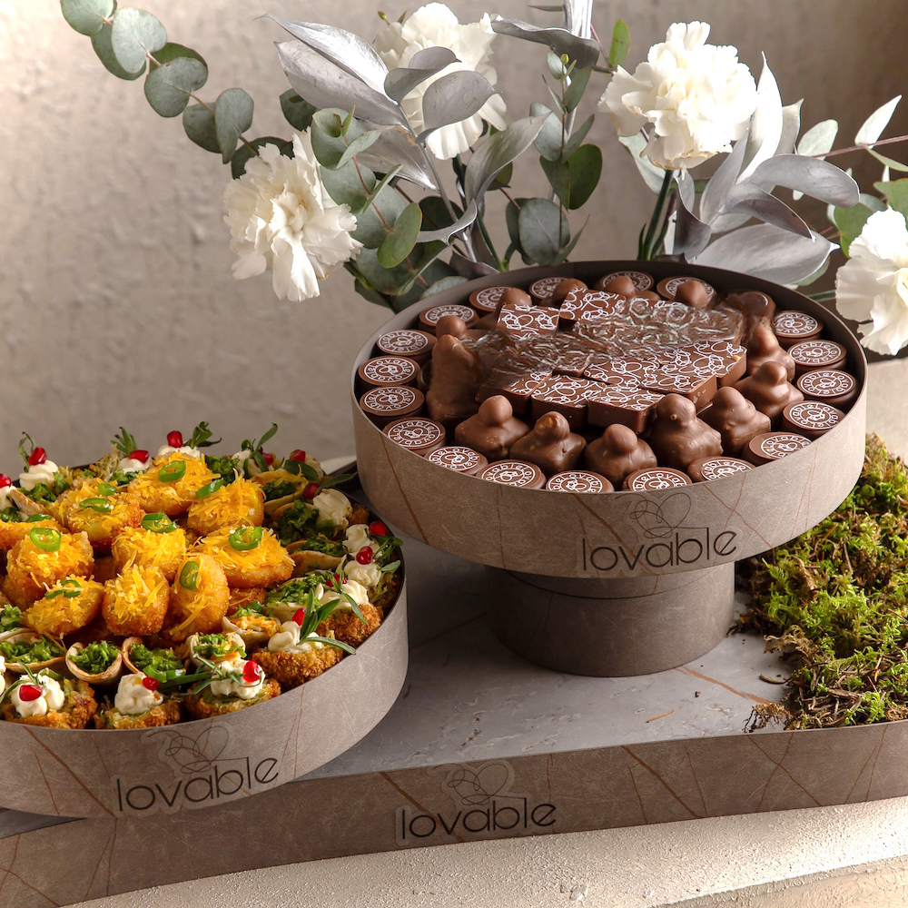 قاعدة رخامية بأزهار جوري طبيعية مع 2 صينية خشبية، تحتوي على 700غ من الشوكولاتة السويسرية و45 قطعة ميني سبيشل موهالي.