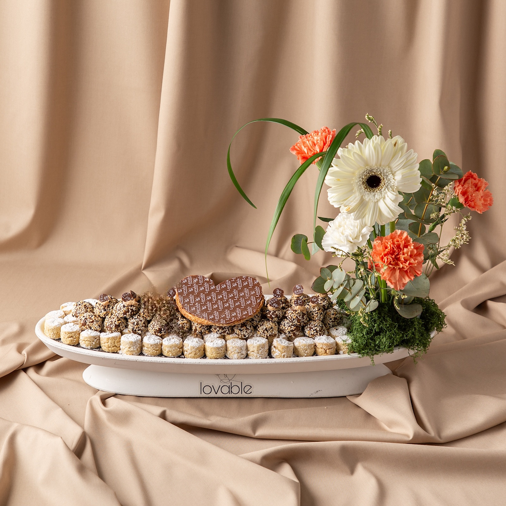 مجموعة من صينيتين من الخشب تحتوي على: 1 كيلو شوكولاتة مع زهور. 1 كيلو غريبة مع زهور.