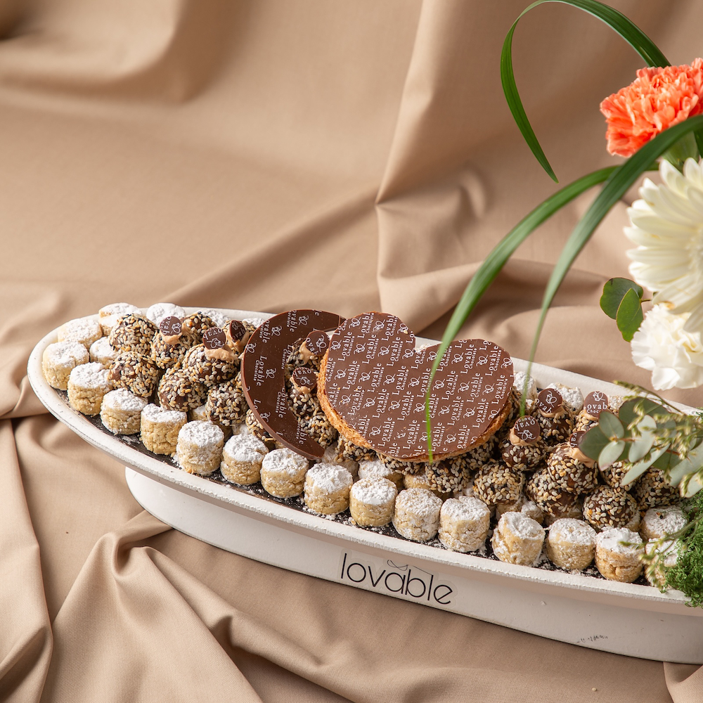 صينيه من الخشب تحتوي على 1 كيلو غريبه كويتية والزهور.