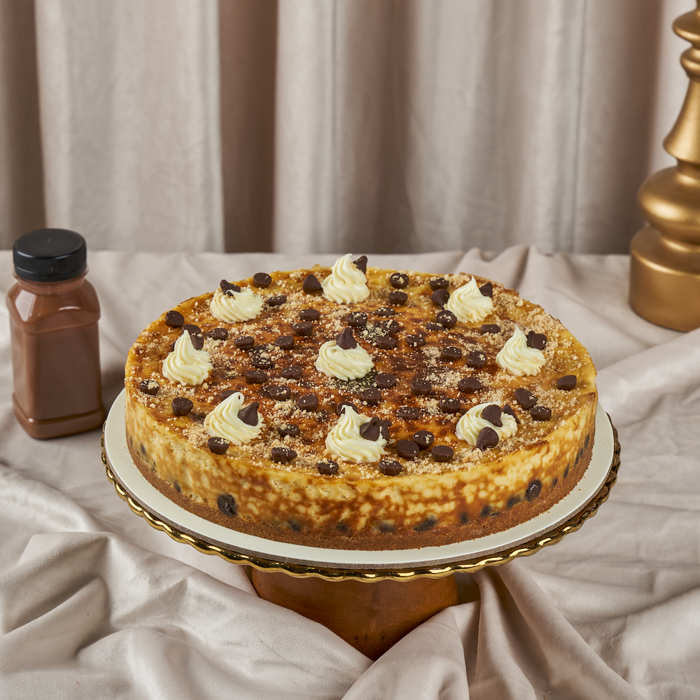 تشيز كيك كريمي مع حشوة الشوكولاتة البيضاء والكريمة مع قطع شوكولاتة الهرشي وطبقة من بسكويت الدايجستيف.