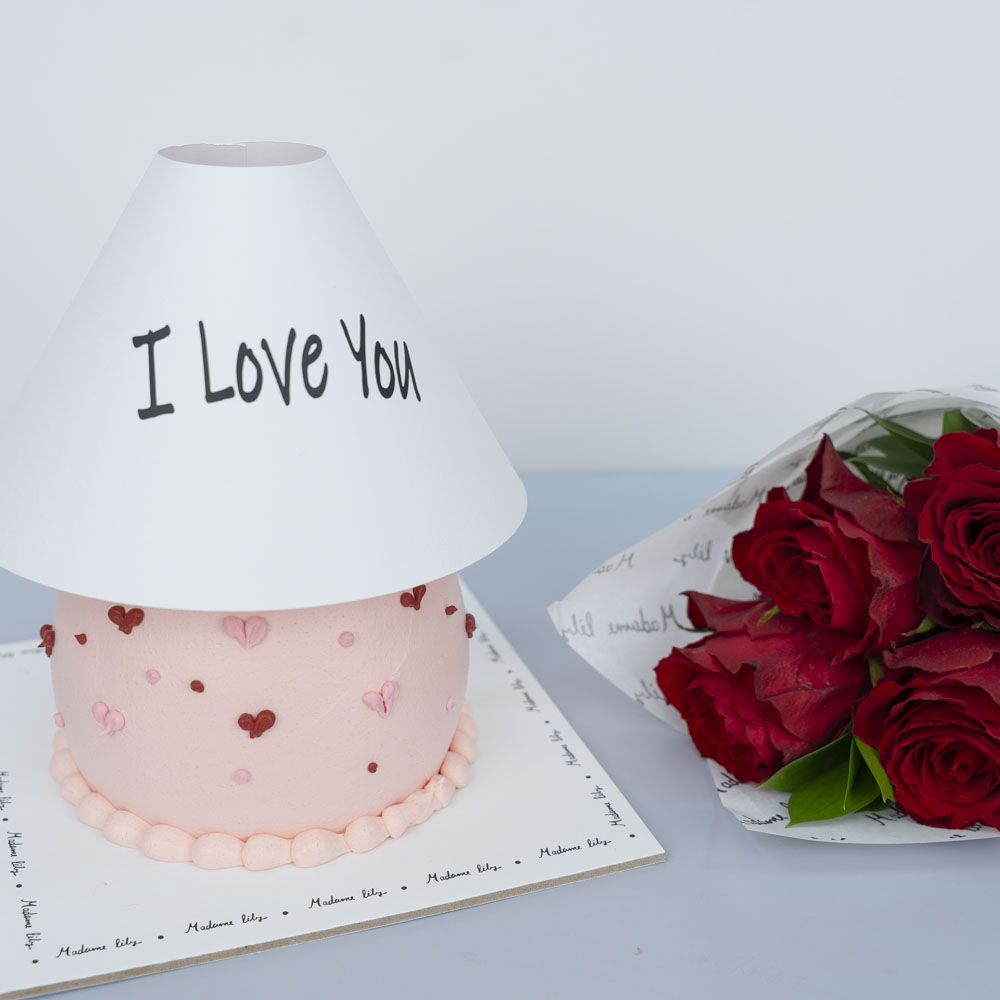 كيكة بنكهة الشوكولاتة مقاس 4 بوصات بتصميم مصباح مع بوكيه ورد صغير، تأتي مع شمعة.