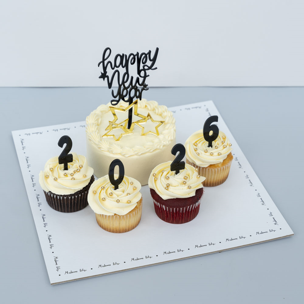 كيكة بينتو بالشوكولاتة بحجم 4 بوصات مع 4 قطع من الكب كيك بنكهات متنوعة: الشوكولاتة والفانيليا والريد فيلفيت.