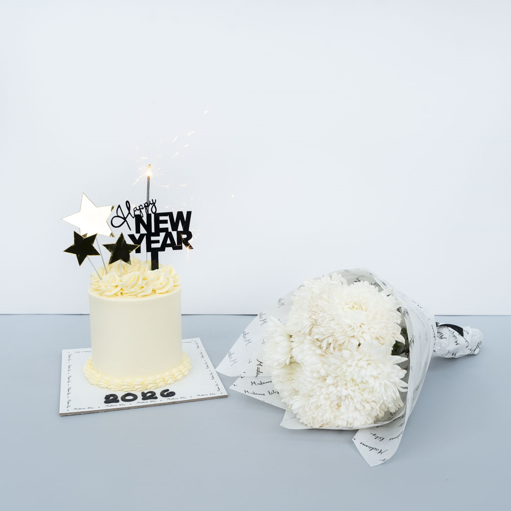 كيكة لذيذة بحجم 4 بوصات يتم تقديمها على لوح مع باقة زهور.