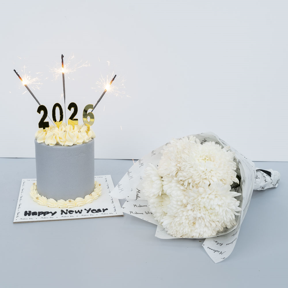 كيكة لذيذة بحجم 4 بوصات يتم تقديمها على لوح مع باقة زهور.