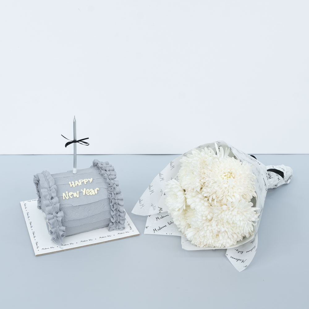 كيكة لذيذة بحجم 4 بوصات يتم تقديمها على لوح مع باقة زهور.