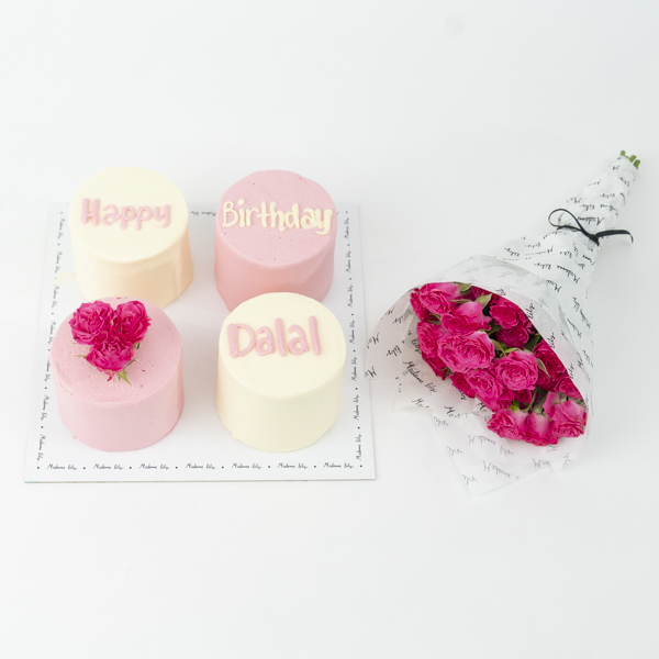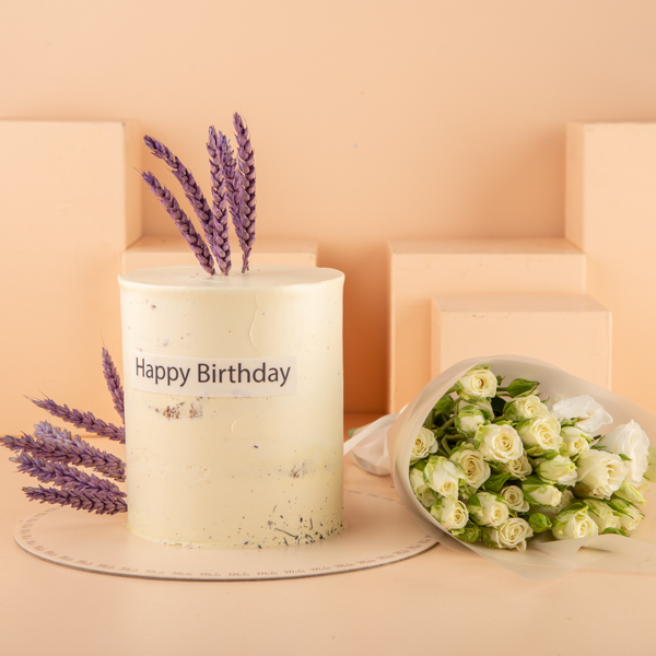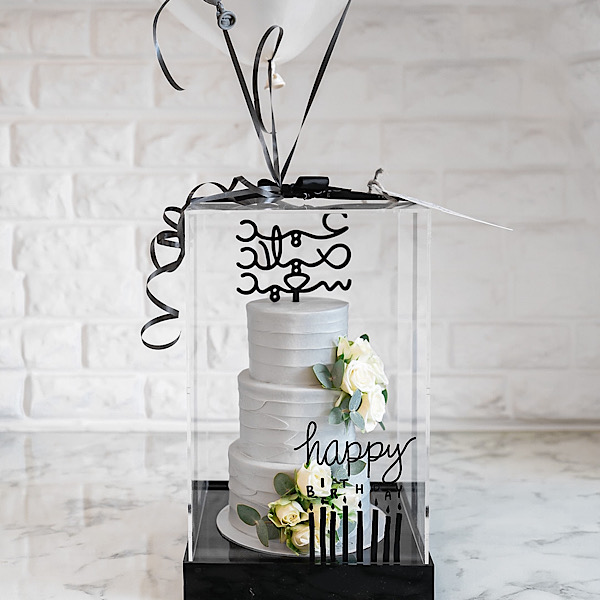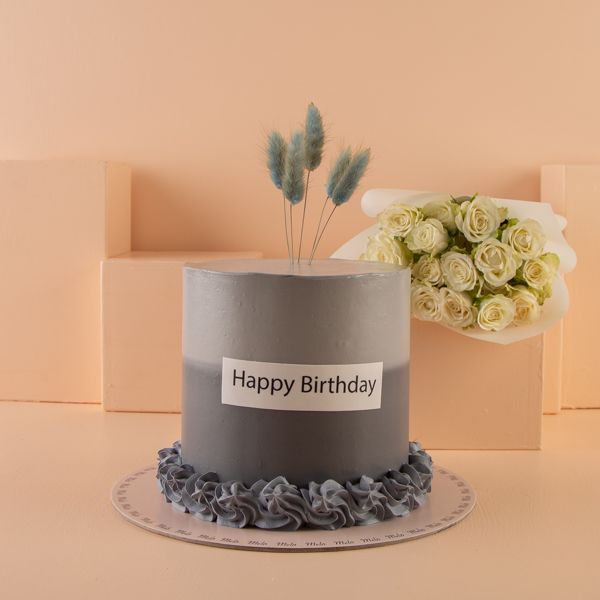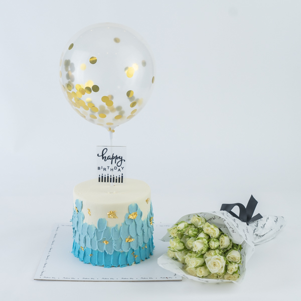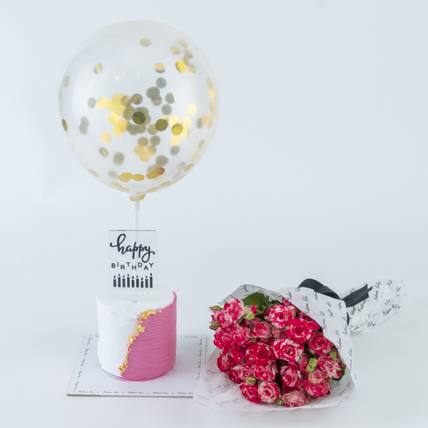 كيكة الشوكولاتة بتصميم جميل مع بالونه وباقة يد بمزيج من الزهور.