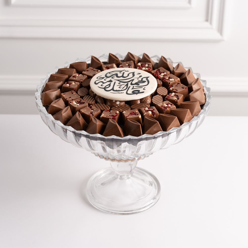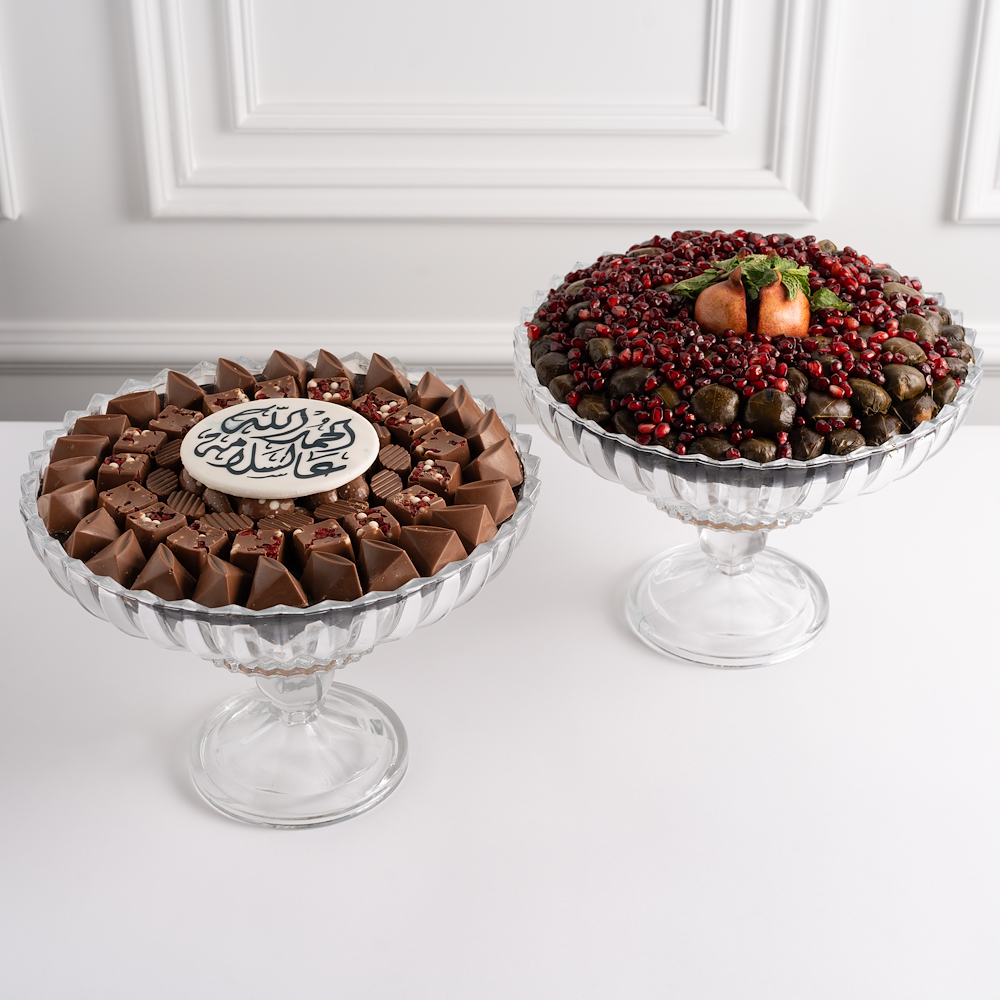 باقة تضم صواني زجاجية حلوة بحشوة الرمان والسمسم، إلى جانب صينية مالحة من ورق العنب المحشي مع دبس الرمان، الليمون، وتزيين بالرمان.