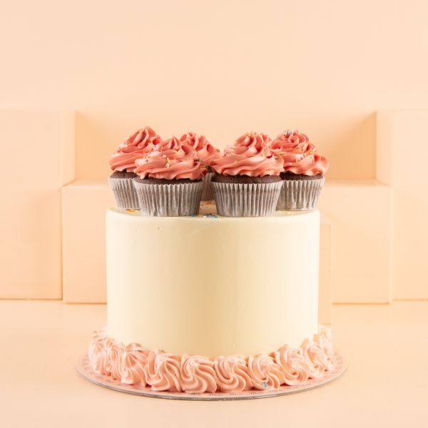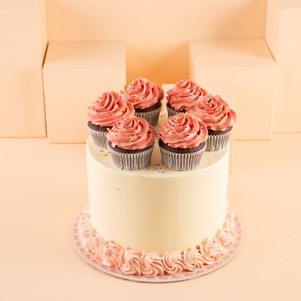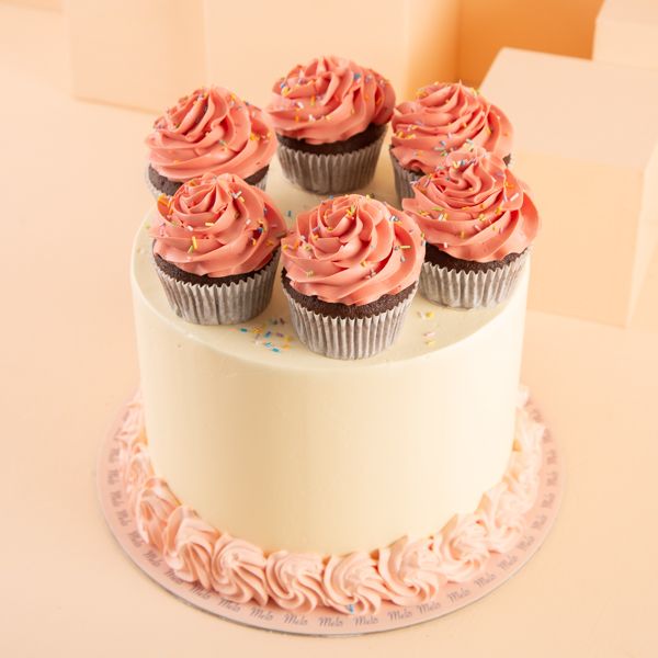 هذه كيكة الفانيليا ميلو مع 6 قطع كب كيك الشوكولاتة في الأعلى. يمكنك اختيار نكهة الفانيليا أو الشوكولاتة أو نكهة ريد فيلفيت، يرجى كتابة ملاحظة بالتفاصيل الإضافية.