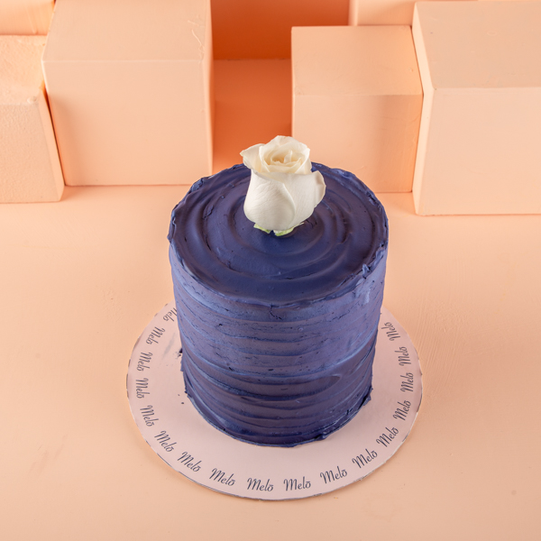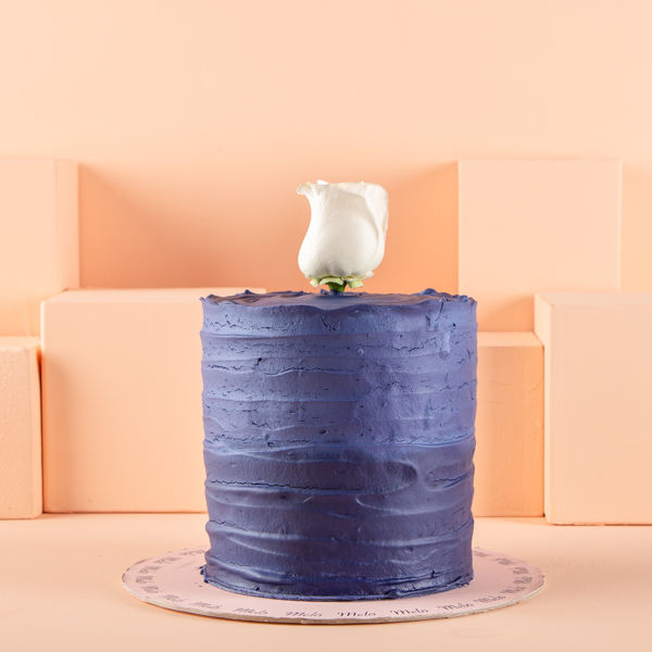 كيك ميلو بالفانيلا مزين بالكريمة الدرجات مع زهرة جوري بيضاء.