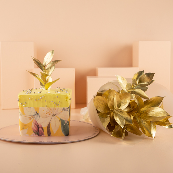 هذه كيكة البتر فروستنق مزينة بنمط ورقة السكر والروسكاس مع باقة يد من الروسكاس.