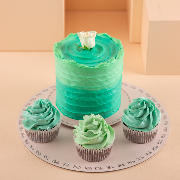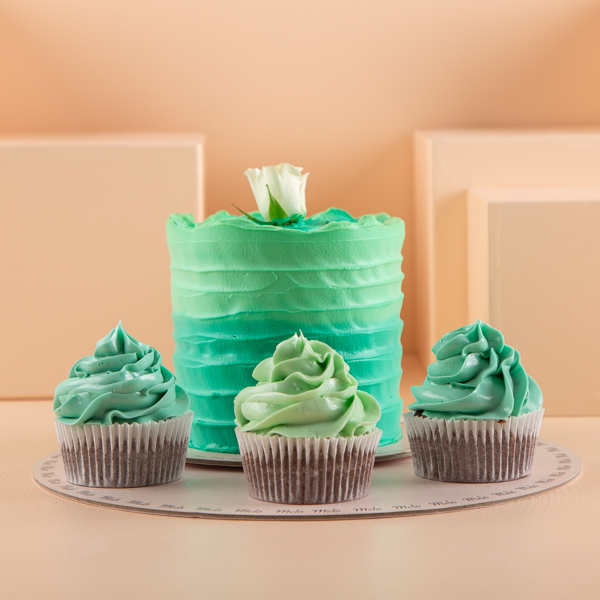 كيك ميلو باللون الاخضر 4 انش مع 3 من الكاب كيك.يمكنك اختيار نكهة الشوكولاته أو الرد فيلفيت يرجى كتابة ملاحظة في تفاصيل إضافية.