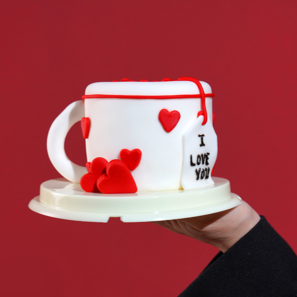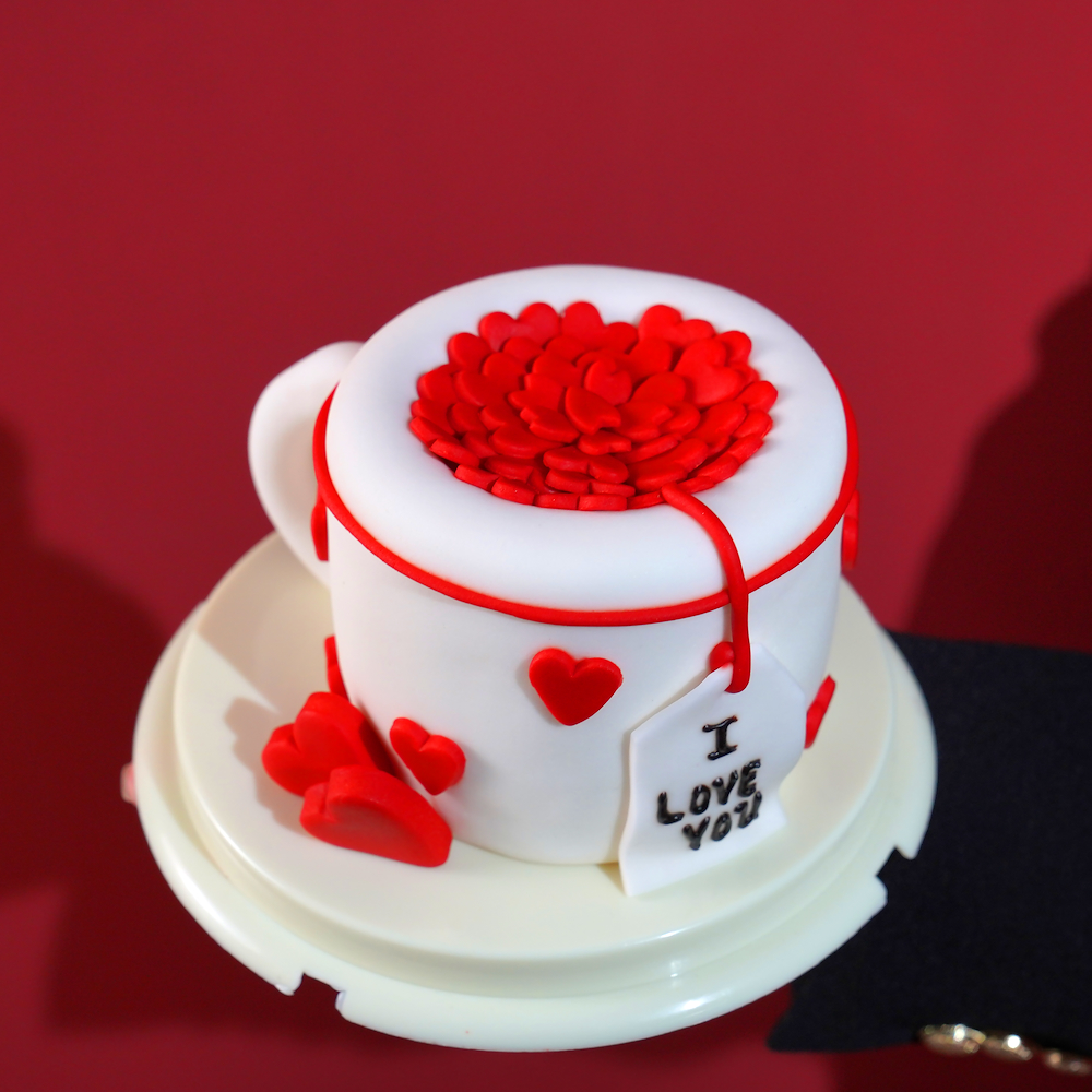 كيكة رد فيلفت بحجم 4 إنش بلمسة أنيقة، مزين بتفاصيل قلوب وبطاقة أنيقة.