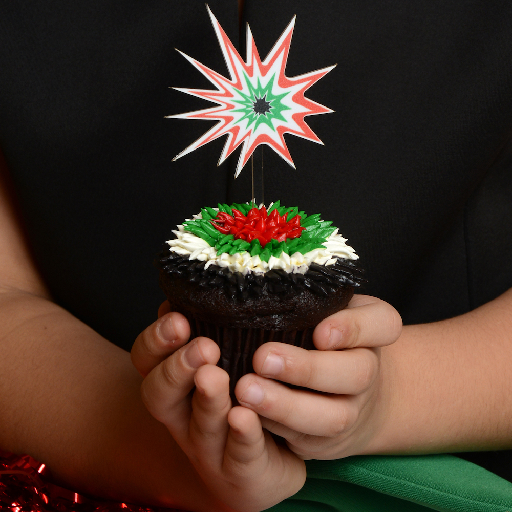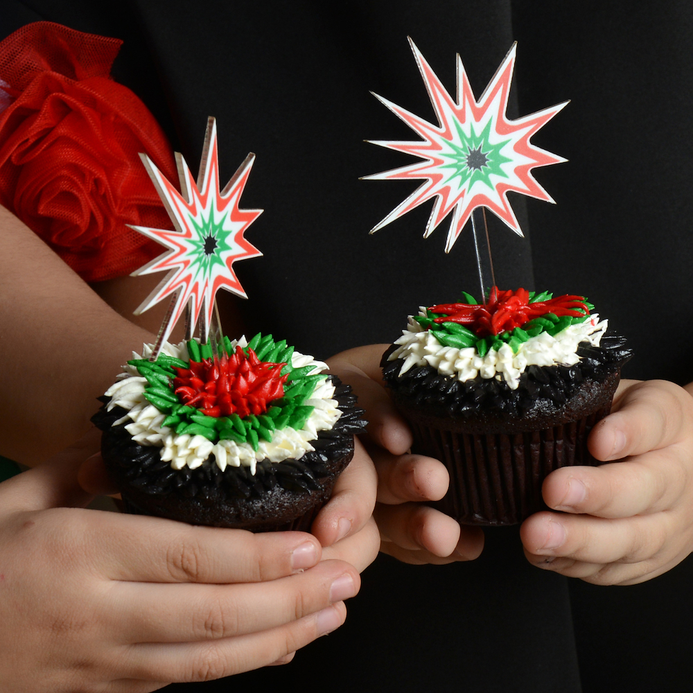درزن كب كيك بتصميم اليوم الوطني الكويتي (12 حبة)، متوفرة بنكهة شوكولاتة ورد ڤيلڤت، مع توبر أكريليك غير صالح للأكل.