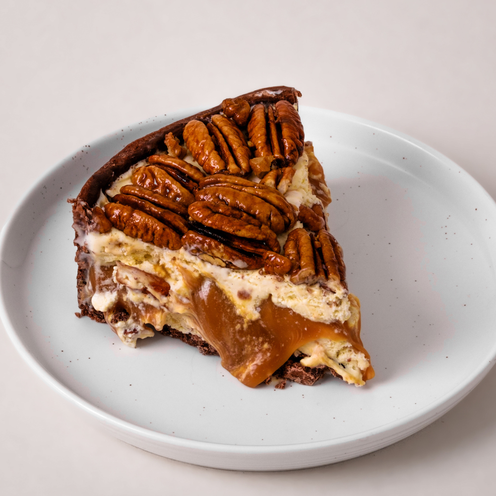 كيكة آيس كريم فطيرة بيكان بطبقة تارت شوكولاتة محشوة بآيس كريم الفانيلا والكراميل وبيكان محمّص، بتوازن مثالي بين الحلاوة والقرمشة، تكفي من 6 إلى 8 أشخاص.
