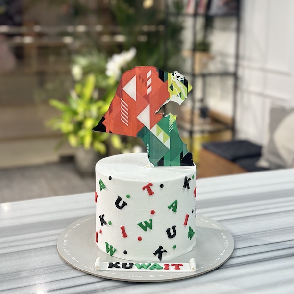 كيكة حجم 6 انش، بنكهة الشوكولاتة والفانيلا، مزينة بأحرف الكويت وخريطة الكويت.