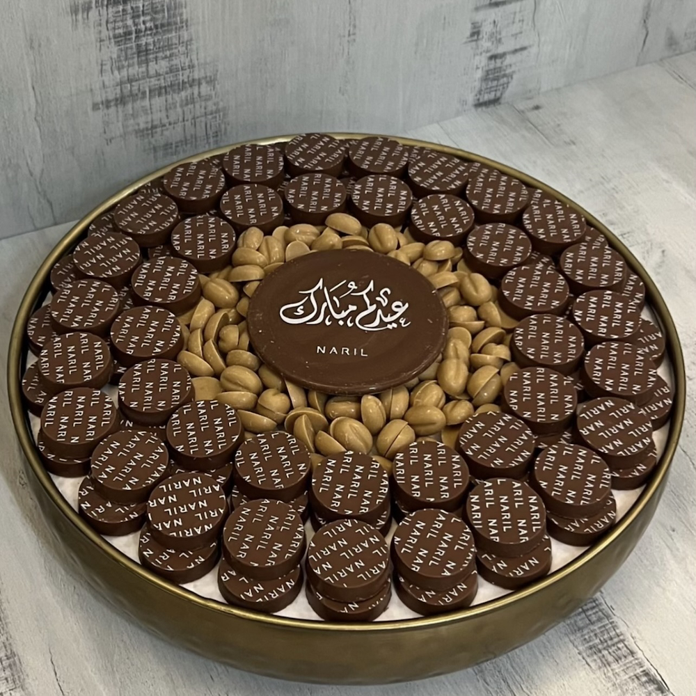 صينية ستيل فاخرة تحتوي على شوكولاتة بحشوة كريمة البندق، مزينة بحبات دولسي الكراميل.