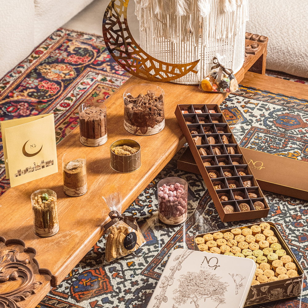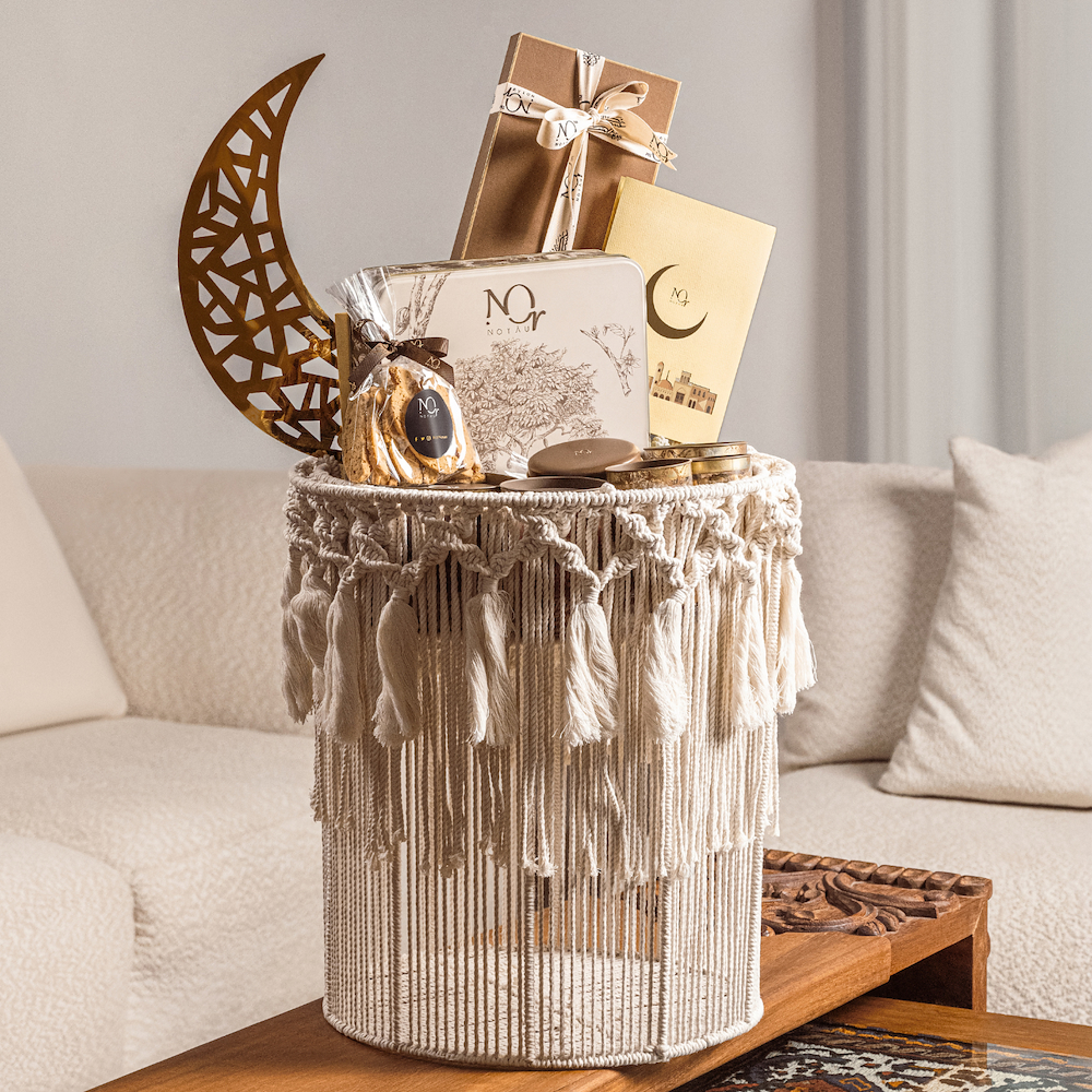 سلة أنيقة تضم تشكيلة مختارة بعناية من أفخر حلويات رمضان، مقدّمة بأسلوب راقٍ يجمع بين العلب والأكياس. تحتوي على علبة كاكاو بنية، بيكان مكرمل، قهوة عربية، اصابع سلاب، أصابع الكراكر، غريبة مشكلة، بسكوت باللوز، وفواكه مجففة.