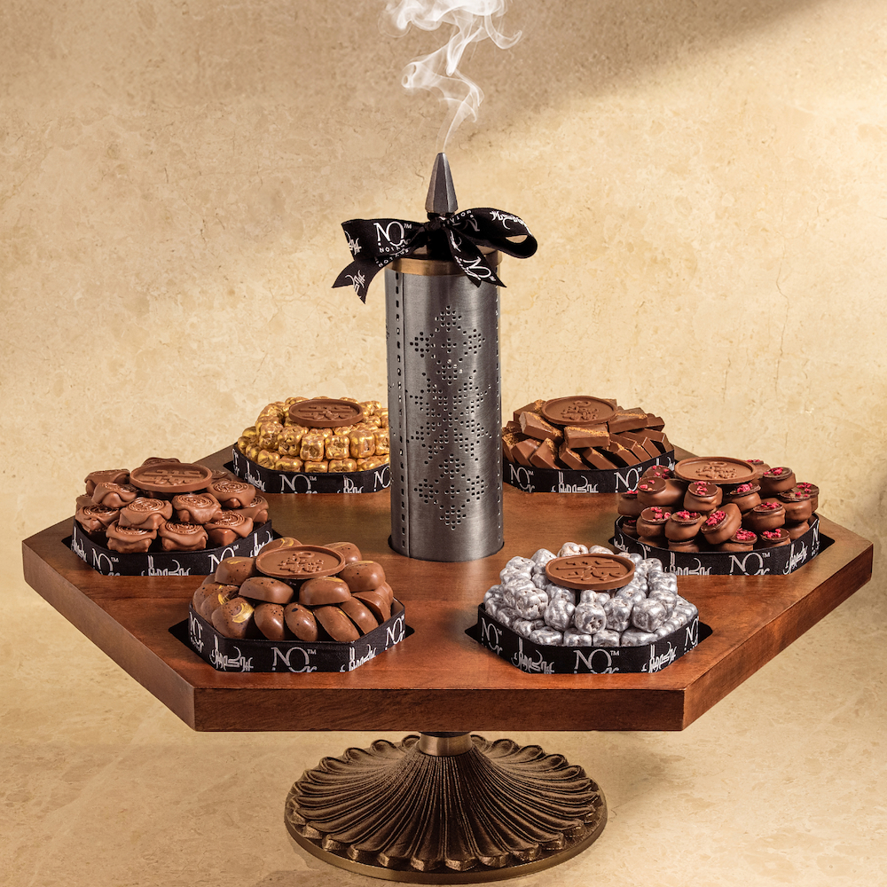 صينية تحتوي على 1 كجم من الشوكولاتة الفاخرة غير المغلفة، وتشمل: سمسم برالين، ماكرو، وهاني رويال.