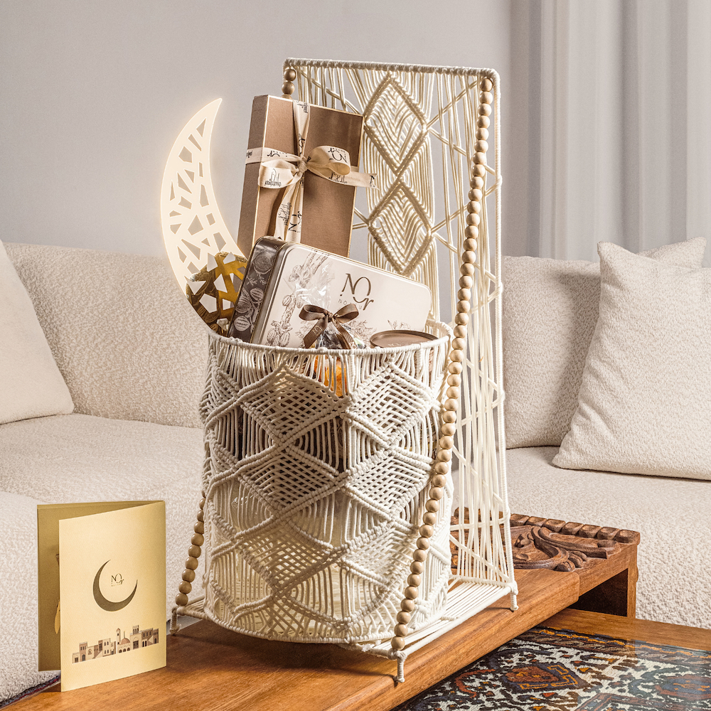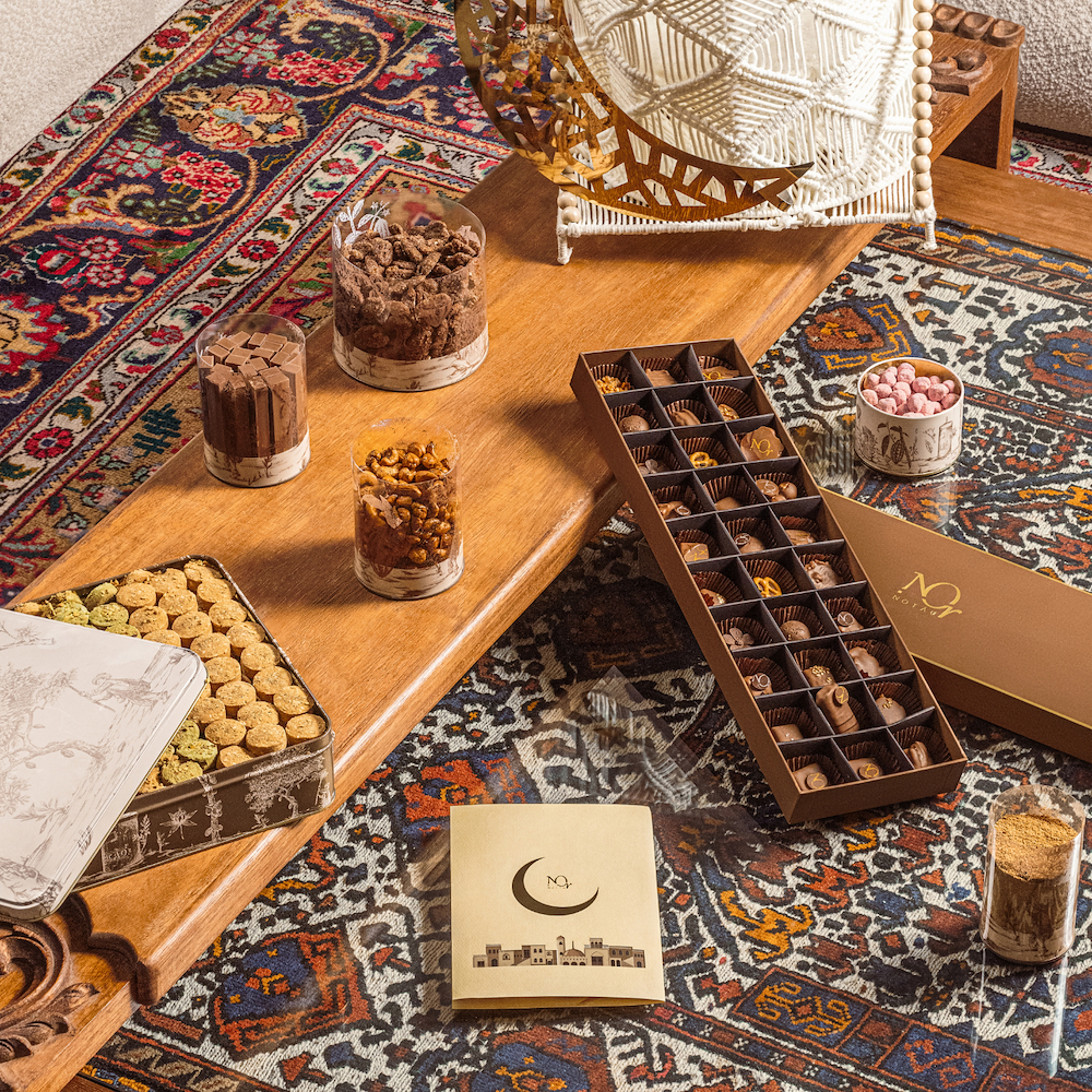 سلة فاخرة تحتوي على تشكيلة مختارة بعناية من حلويات رمضان، مقدمة بمزيج من العلب والأكياس. تشمل التشكيلة علبة كاكاو بنية، الغريبة المشكلة، بيكان كارنفال، بسكوت اللوز، كاجو بالزعتر، اصابع الكراكر، دراجيه البندق، فواكه مجففة، اصابع سلاب، والقهوة العربية.