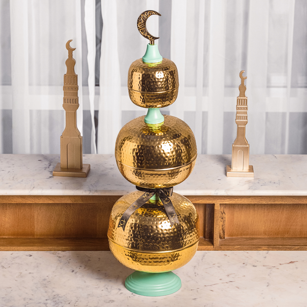 أبراج ضيافة ذهبية بأطباق متدرجة، كل وعاء يحتوي على شوكولاتتنا الأكثر مبيعاً. الكمية : 1.8 كيلو.