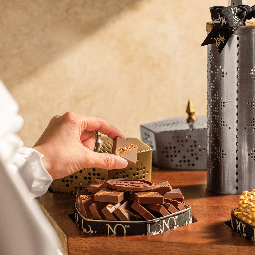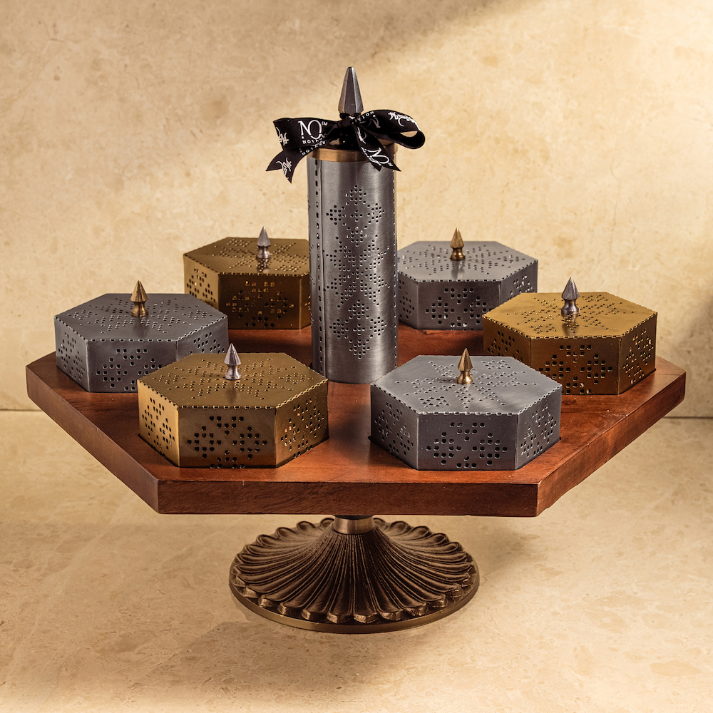 قاعدة خشبية تدور مع مبخر بتصميم مميز و6 أطباق معدنية ، تحتوي على 1.8 كيلو من شوكولاتة البرافيه، الموكا، مكعبات دراجيه التوت، العسل الملكي، والماكرو، مع بطاقة "عيد مبارك" من الشوكولاتة.
