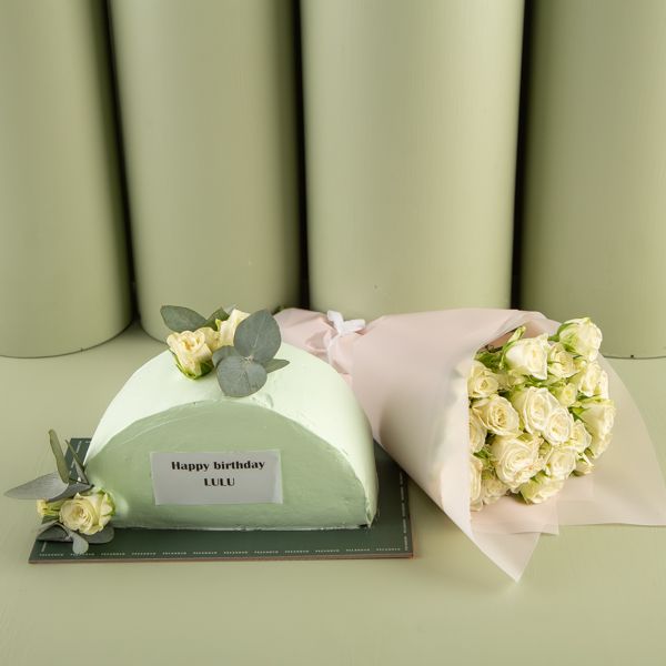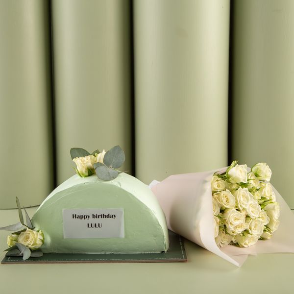 كيك بيكا نصف قمر مزين بالكريمه و الورد مع باقه من الزهور.