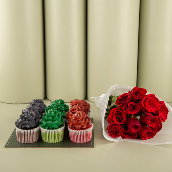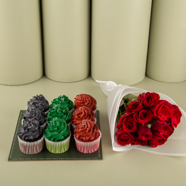 9 قطع كبكيك في 3 ألوان الكويت متنوعة مع باقة يد زهور.
