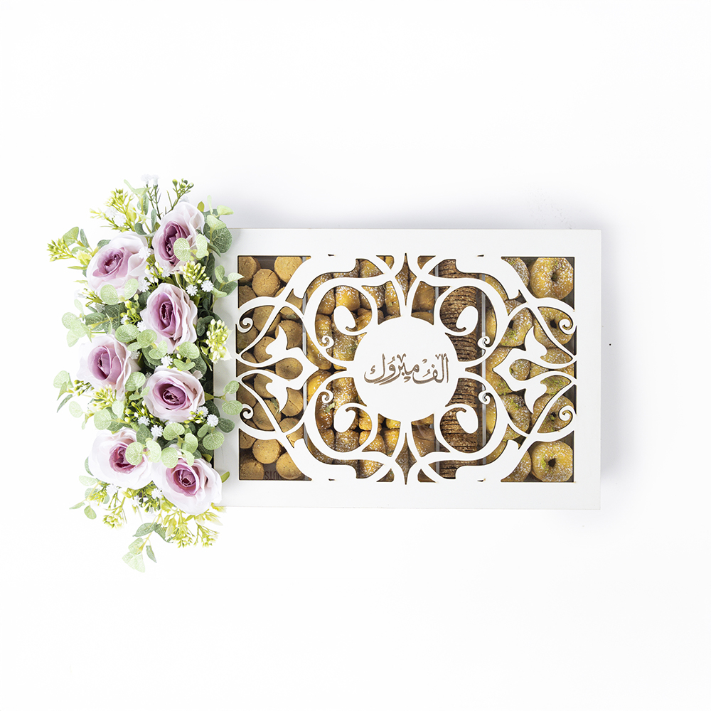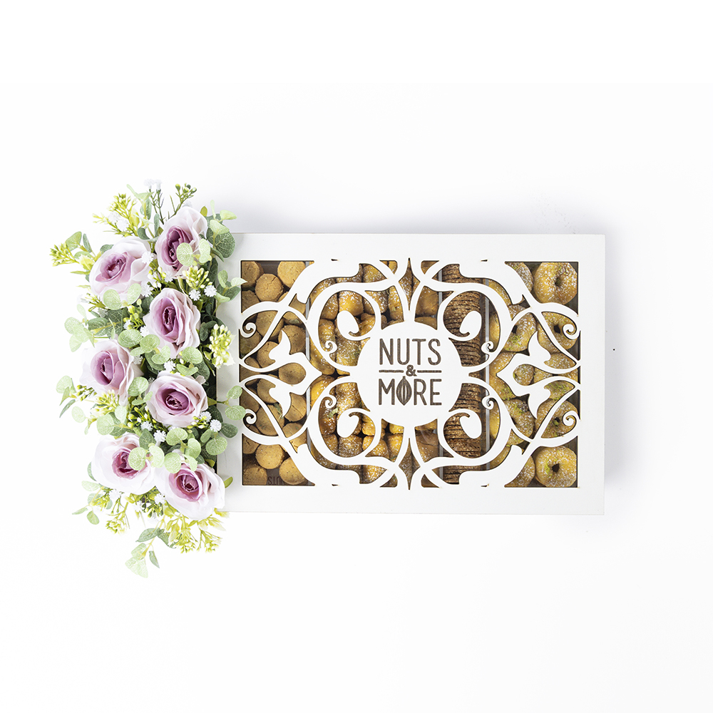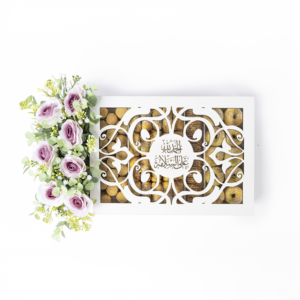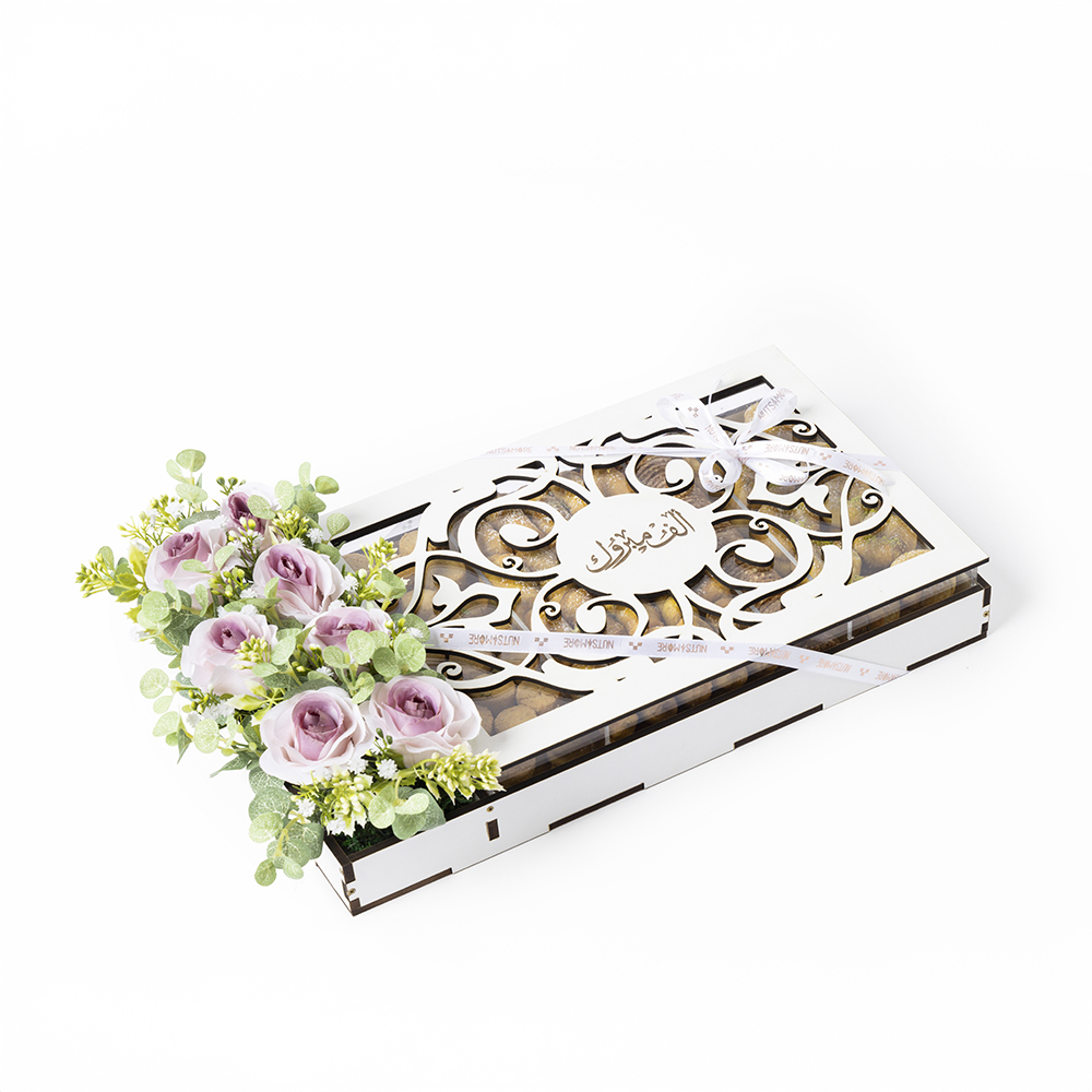 بوكس أنيق يضم أربعة أنواع من الحلويات العربية، دملوج بالجوز والفستق، الغريبة الملكية، والسمسمية.