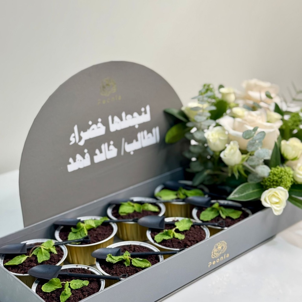 8 قطع كب كيك داخل صندوق بيونيا مع الزهور، ويمكنكم الكتابة على الصندوق حسب الطلب.