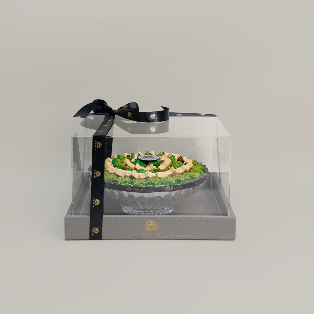 صينية كريستال تحتوي على غريبه بحشوه البيكان والبستاشيو داخل بوكس اكريليك راقي.