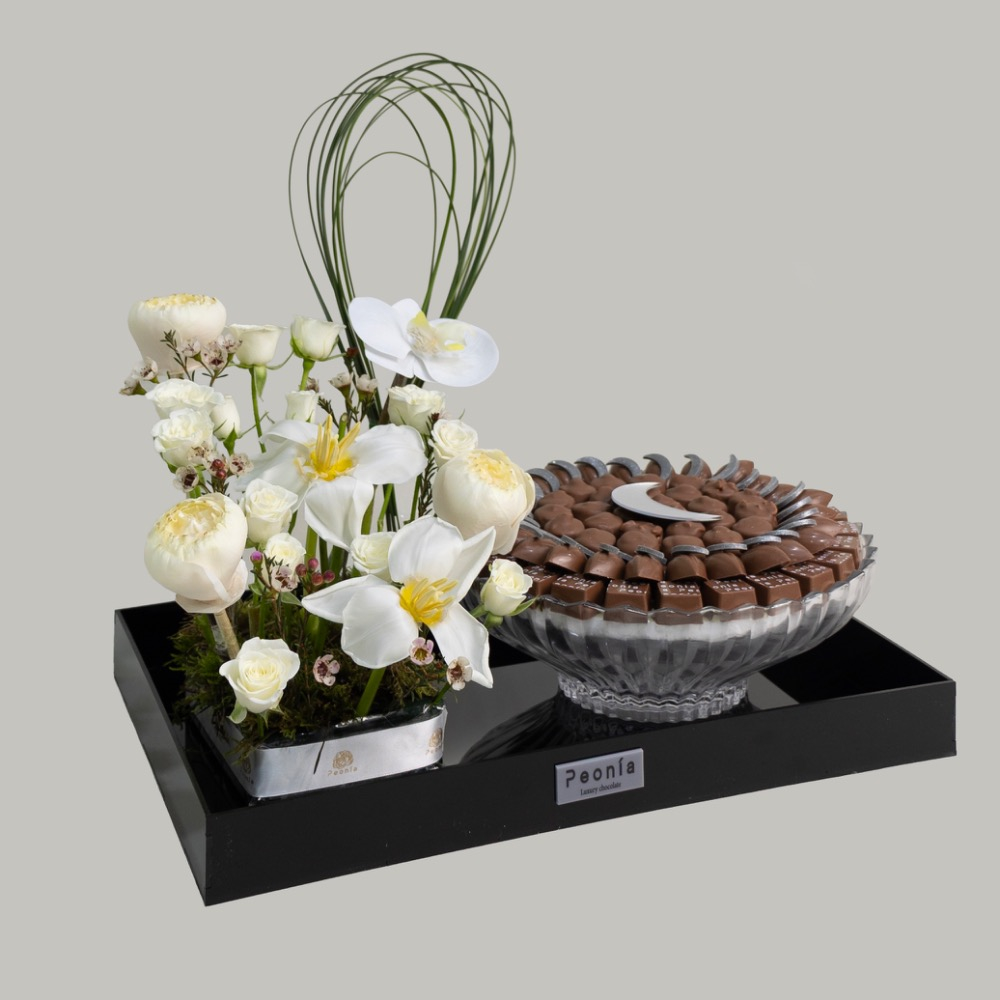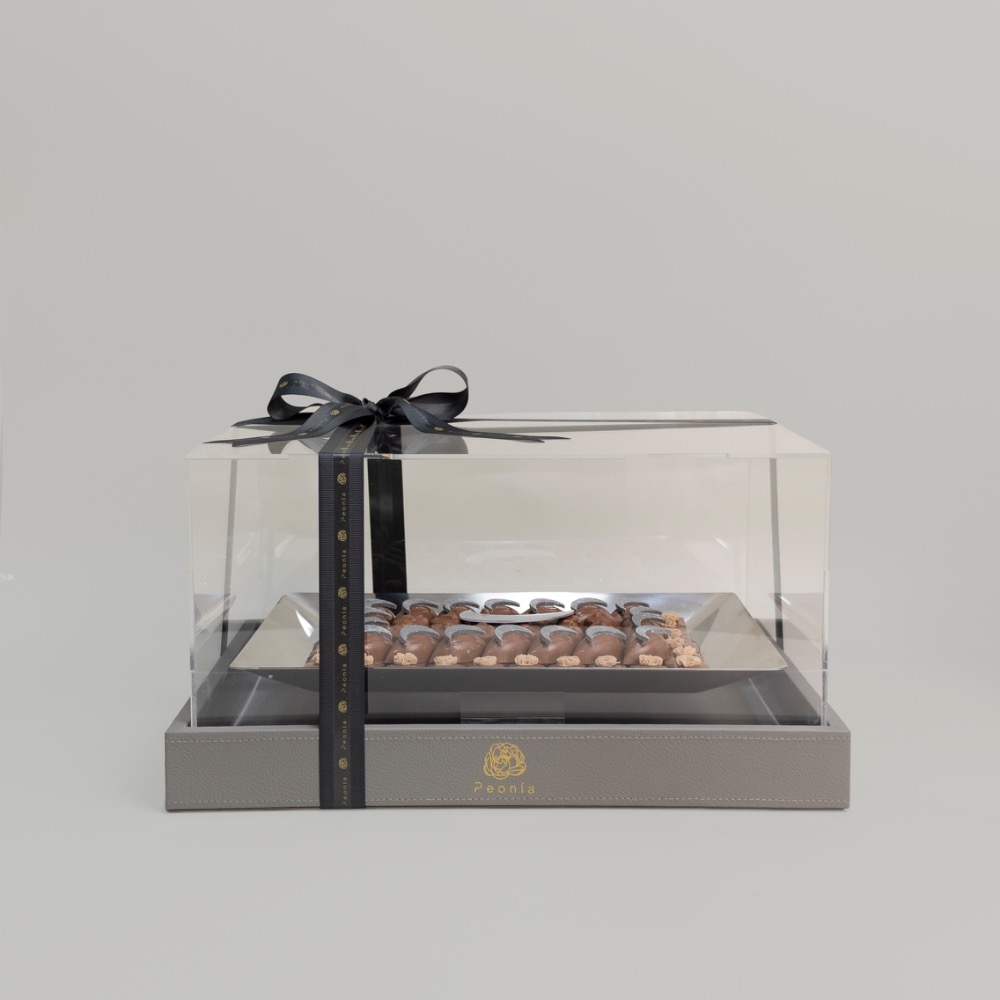 بوكس أكريليك بتصميم صينية كريستال مع 890غ من شوكولاتة فرنسية، حوالي 93 قطعة، بحشوات مشكلة تشمل براوني، حلاوة، وكراميل فول سوداني مملح.