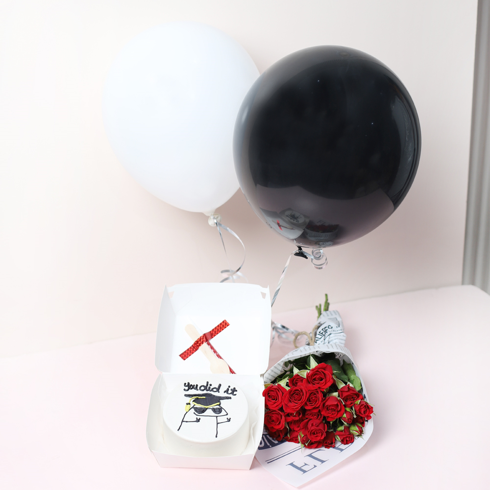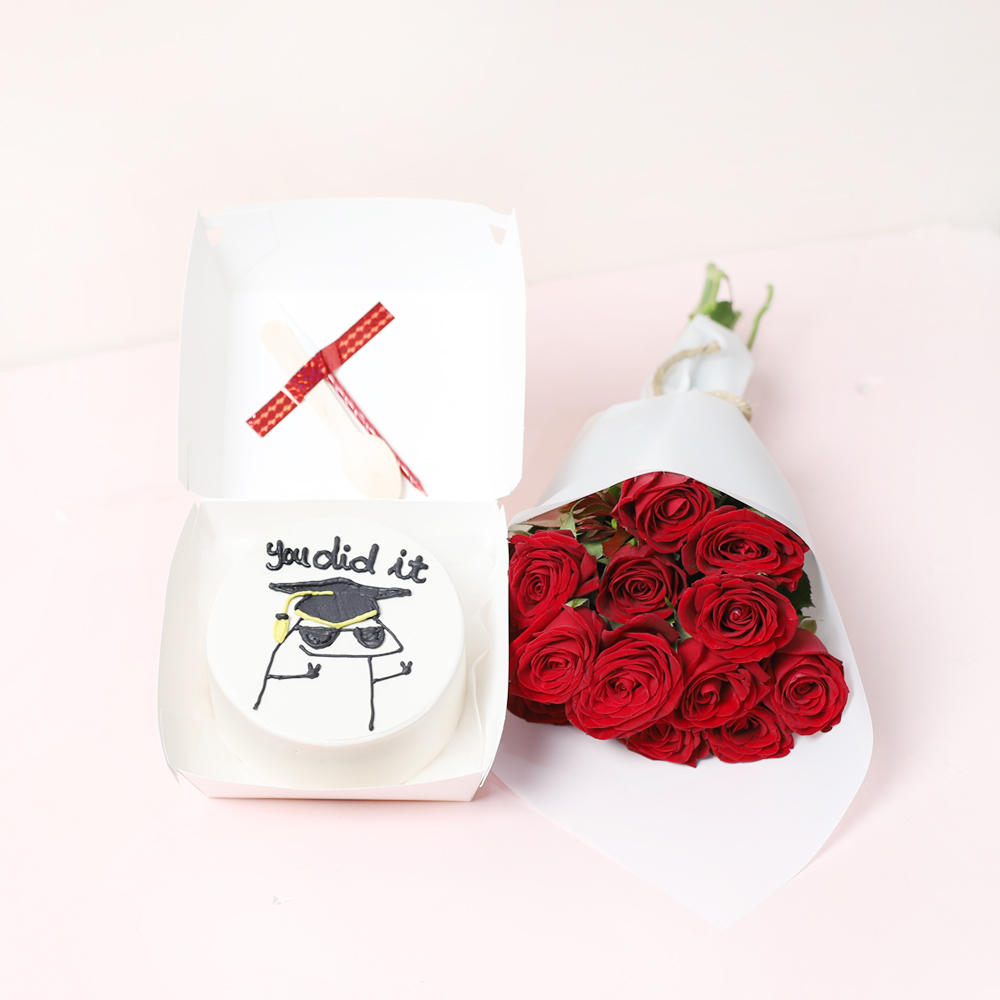 كيكة بينتو مستديرة الشكل مزينة بباقة صغيرة من الورود الحمراء بتصميم بسيط. معبأة في علبة غداء كلاسيكية صديقة للبيئة، وتتضمن ملعقة خشبية وشمعة.