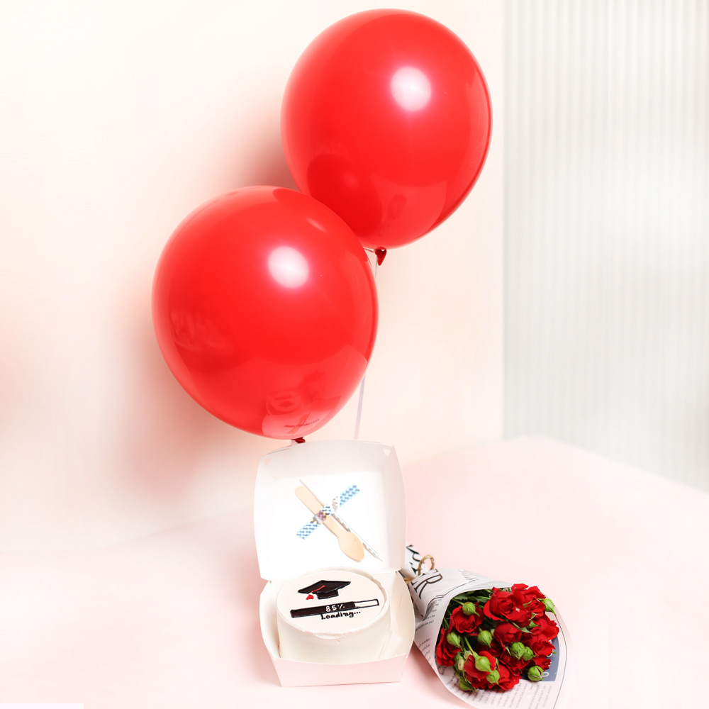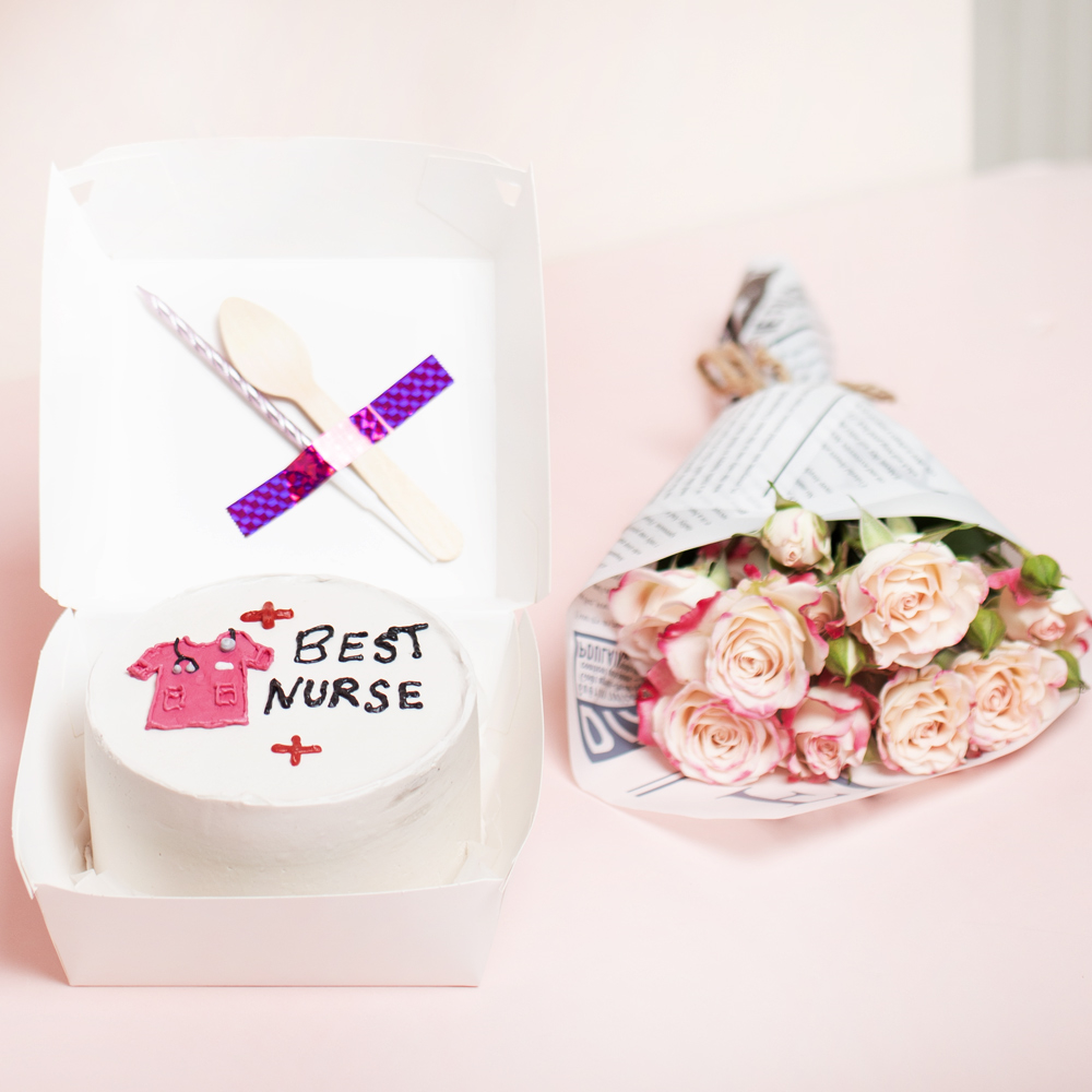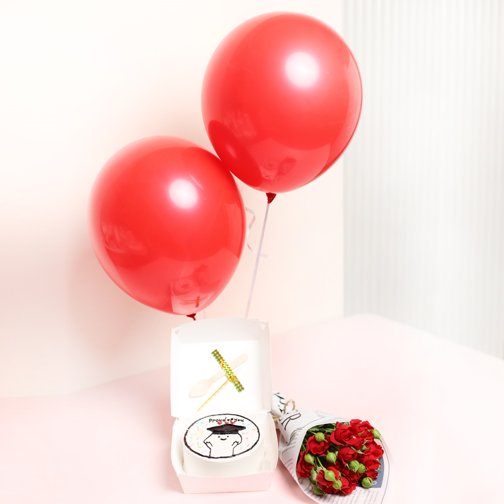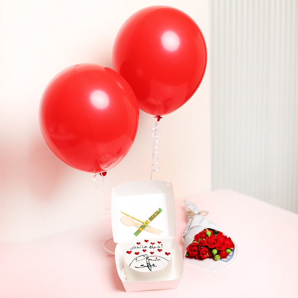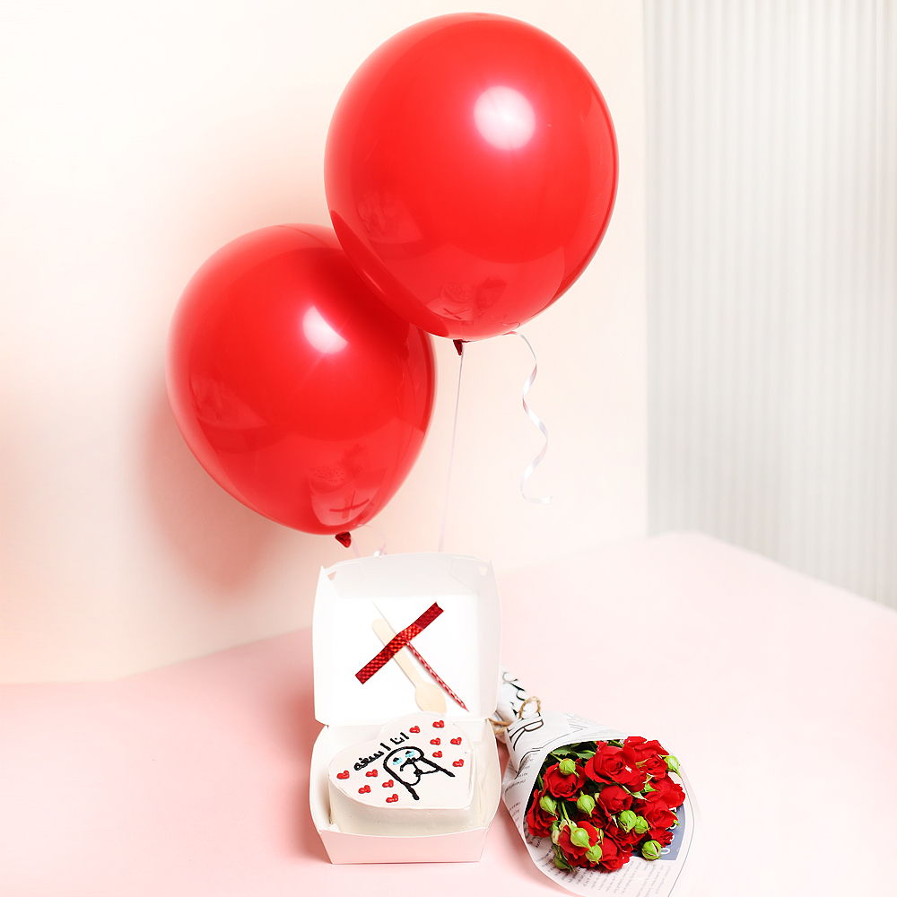 كيكة بنتو مقاس 4 إنش لشخصين مع بوكيه زهور صغير وبالونات وملعقة وشمعة.