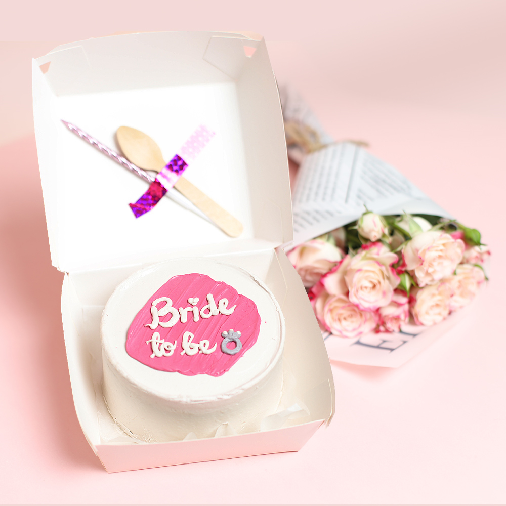 كيكة بينتو الفانيلا بحجم 4-إنش تكفي الى شخصين، مع ملعقة، شمعة، وباقة زهور ميني.