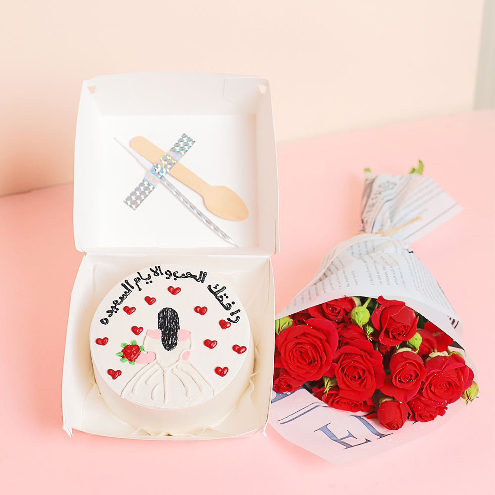 كيكة بنتو مقاس 4 إنش لشخصين مع بوكيه زهور صغير وبالونات وملعقة وشمعة.